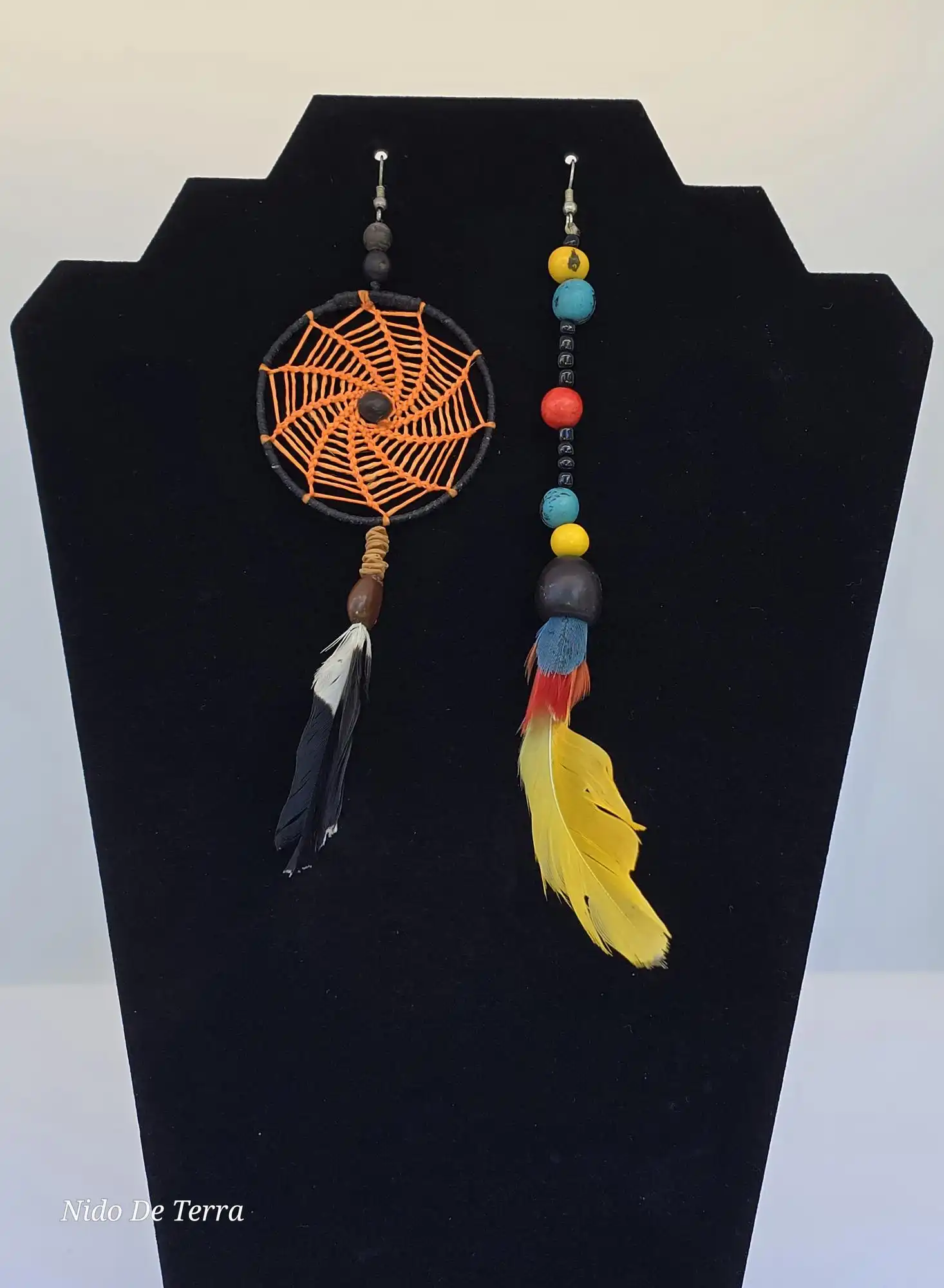 Aretes artesanales con diseño asimétrico que combina un atrapasueños tejido en hilo naranja sobre aro negro, acompañado de plumas negras con puntas blancas, y un segundo arete compuesto por chakiras en tonos fuego y tierra —negro azul amarillo rojo y turquesa— que culmina en una pluma amarilla con acentos rojos. Esta pieza celebra la dualidad y el equilibrio entre lo espiritual y lo vibrante, ideal para quienes desean portar una joya con carácter libre, simbólico y profundamente artesanal.