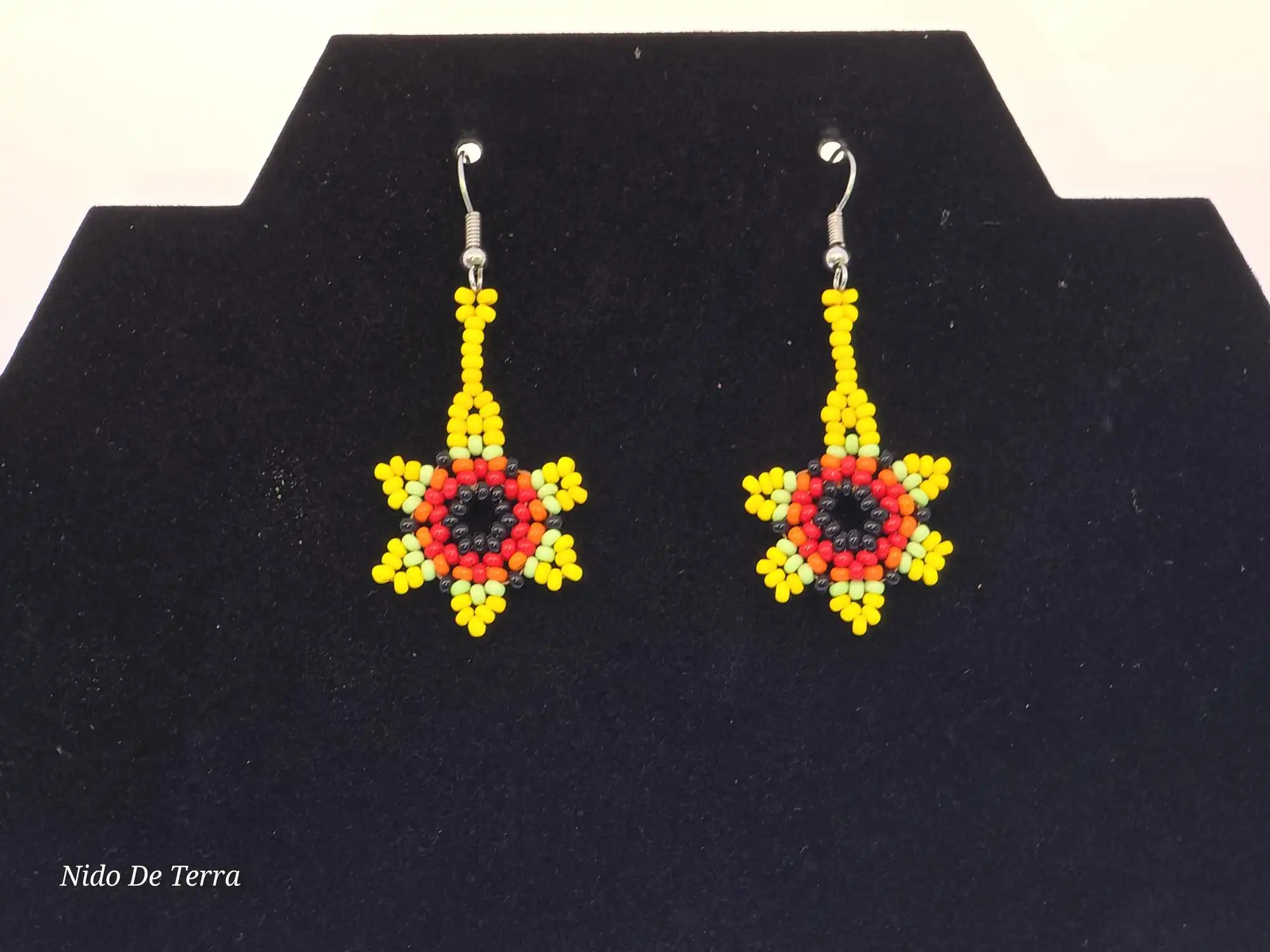 Aretes artesanales en forma de girasol con chakiras amarillo rojo y negro.