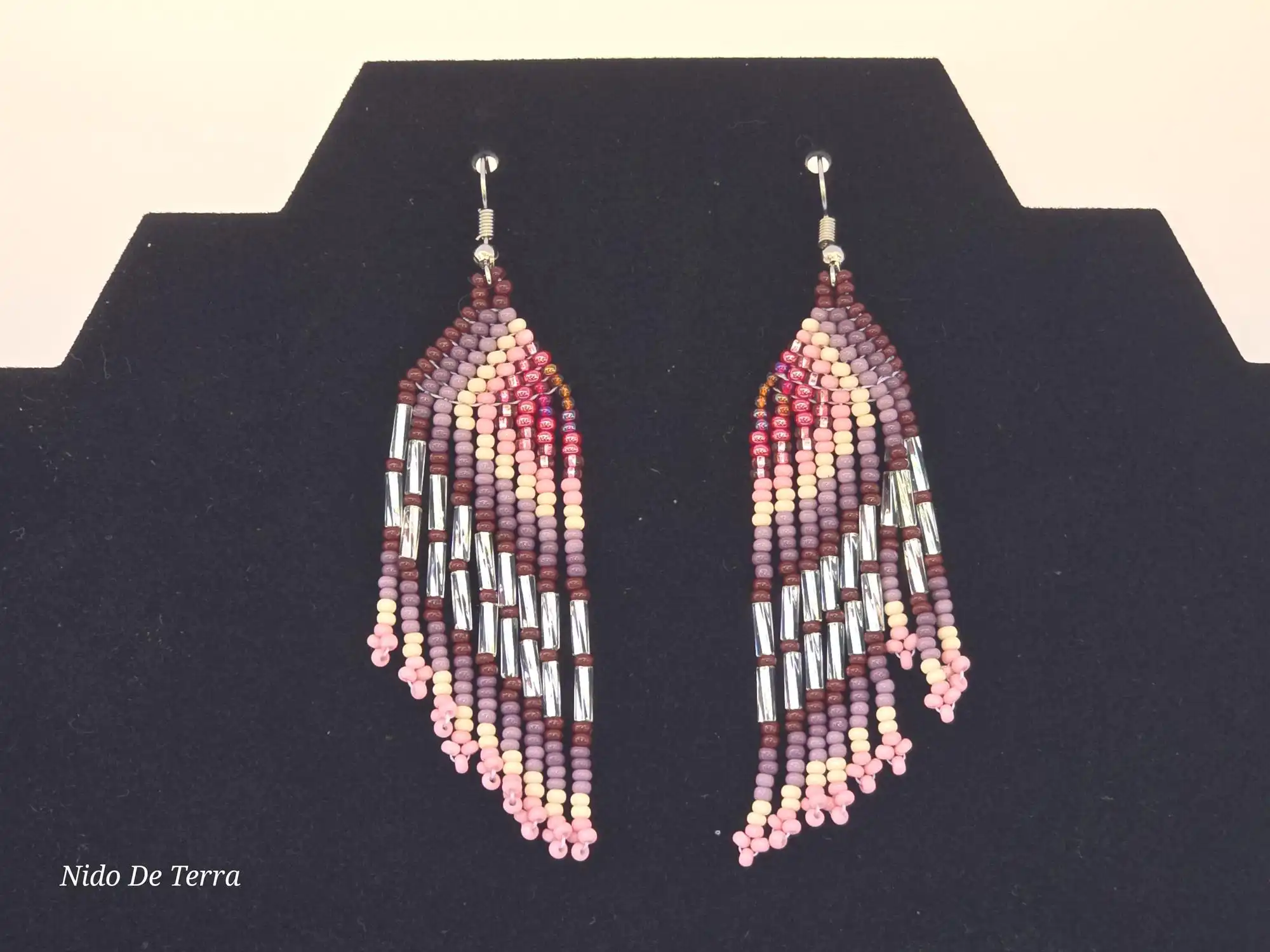 Aretes tejidos a mano con chakiras en tonos rosa rojo burdeos y plateado, formando un diseño alado que evoca ligereza y movimiento. Las líneas diagonales en tonos metálicos aportan brillo y profundidad, mientras el gancho plateado complementa la armonía cromática. Esta pieza combina elegancia y tradición, ideal para quienes buscan un accesorio con carácter femenino y artesanal, que celebra el detalle y la expresión cultural.