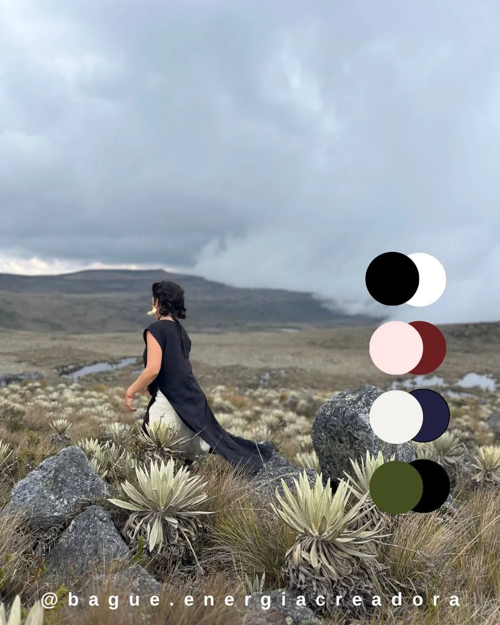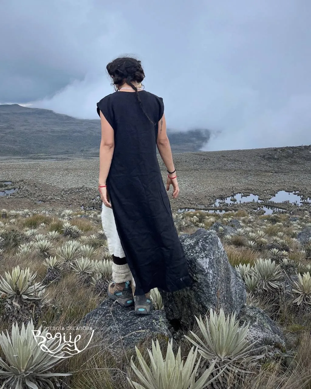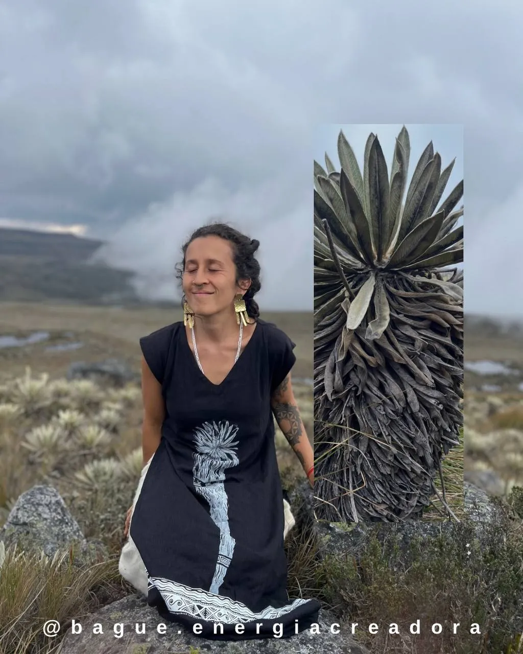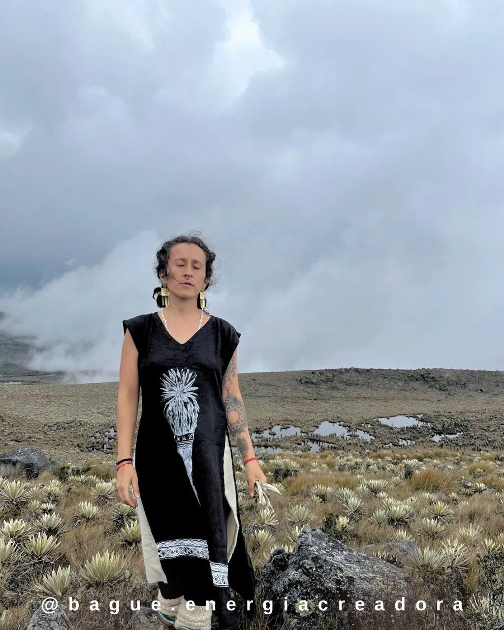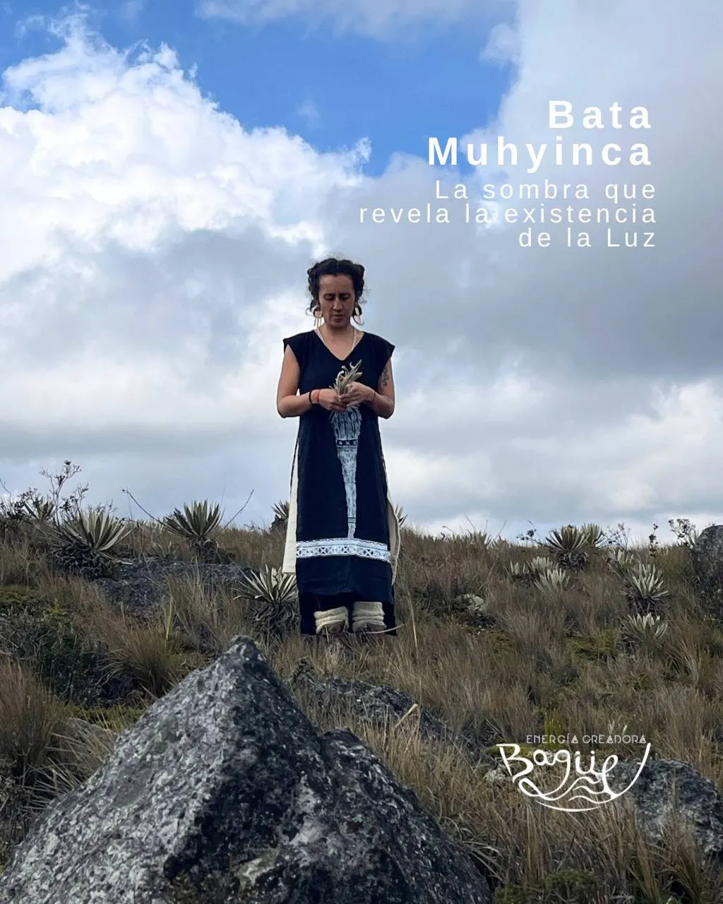 Descubre la Bata Muhyinca, una pieza poderosa que te invita a honrar tu «Sagrada Sombra». Su diseño, con el tejido negro, el Guake/frailejón, el agua y la doble espiral, trae a la memoria la importancia de la sombra como catalizador que, al ser trabajada, revela la existencia de la Luz y genera una profunda fuerza interior.