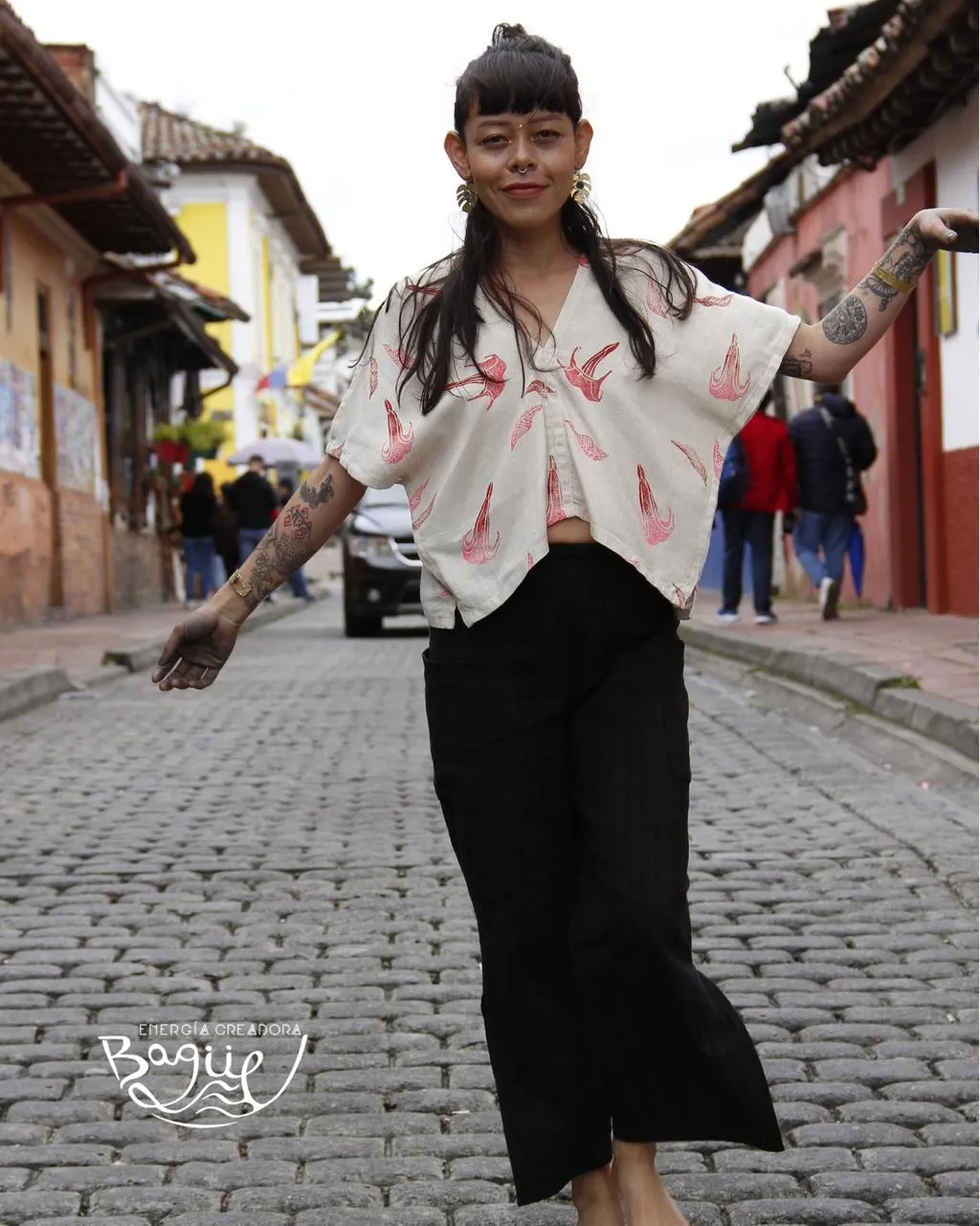 Descubre la Blusa Tyhyky, una prenda envuelta en el misterio del territorio muisca. Su simbología de flores Tyhyky evoca la fuerza que se revela en la ensoñación, preparando a quien la viste para la vigilia con la mirada limpia.
