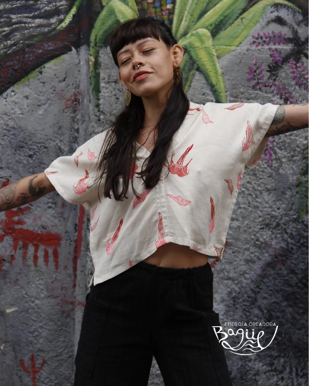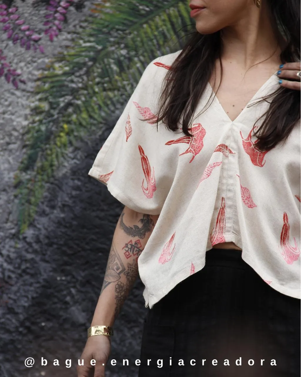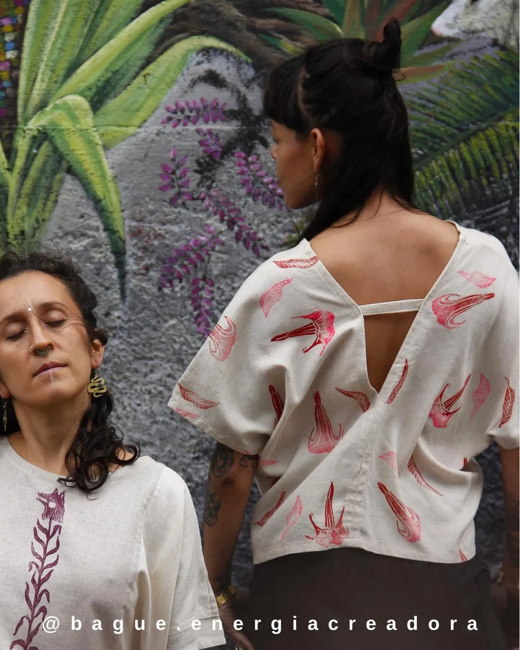 Material y Confección: Elaborada con 100% fibra natural, es una blusa cómoda, intencionada y sostenida por un rezo de fuerza y dulzura femenina, convirtiéndose en un elemento de poder.