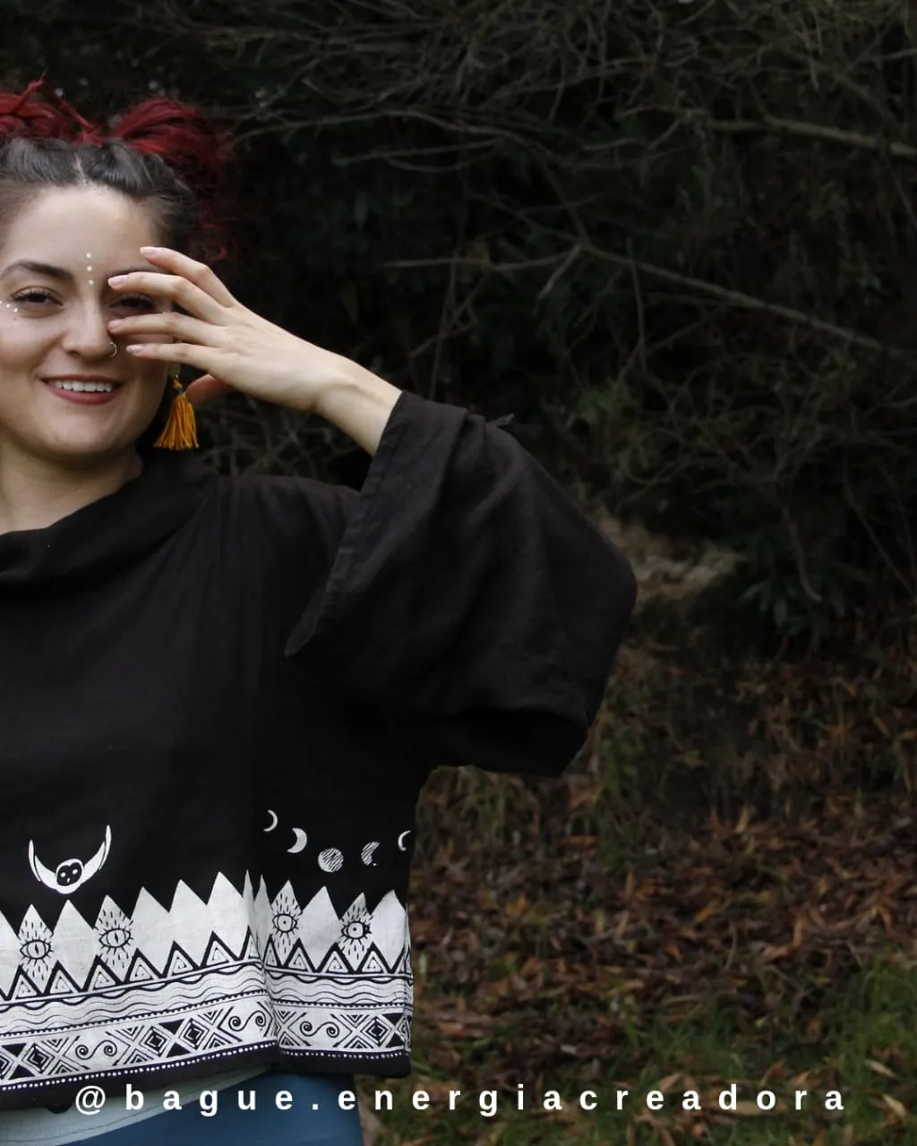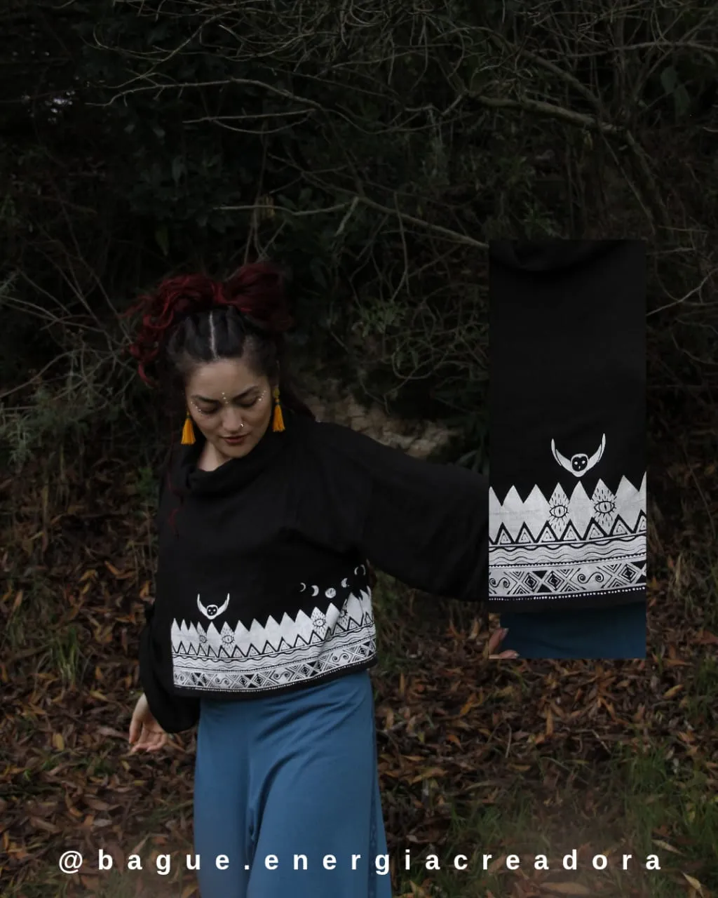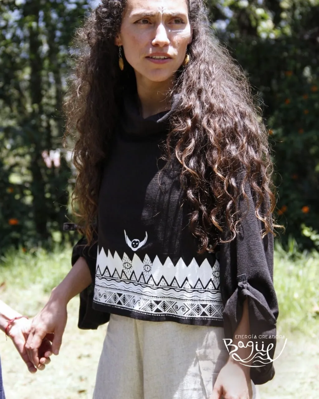 Descubre el Buso Huitaca, una pieza poderosa que trae un hermoso tejido simbólico para invocar la visión clara durante todos tus tránsitos. Evoca el autoconocimiento, la compasión y el permiso para duelar, morir y renacer constantemente.