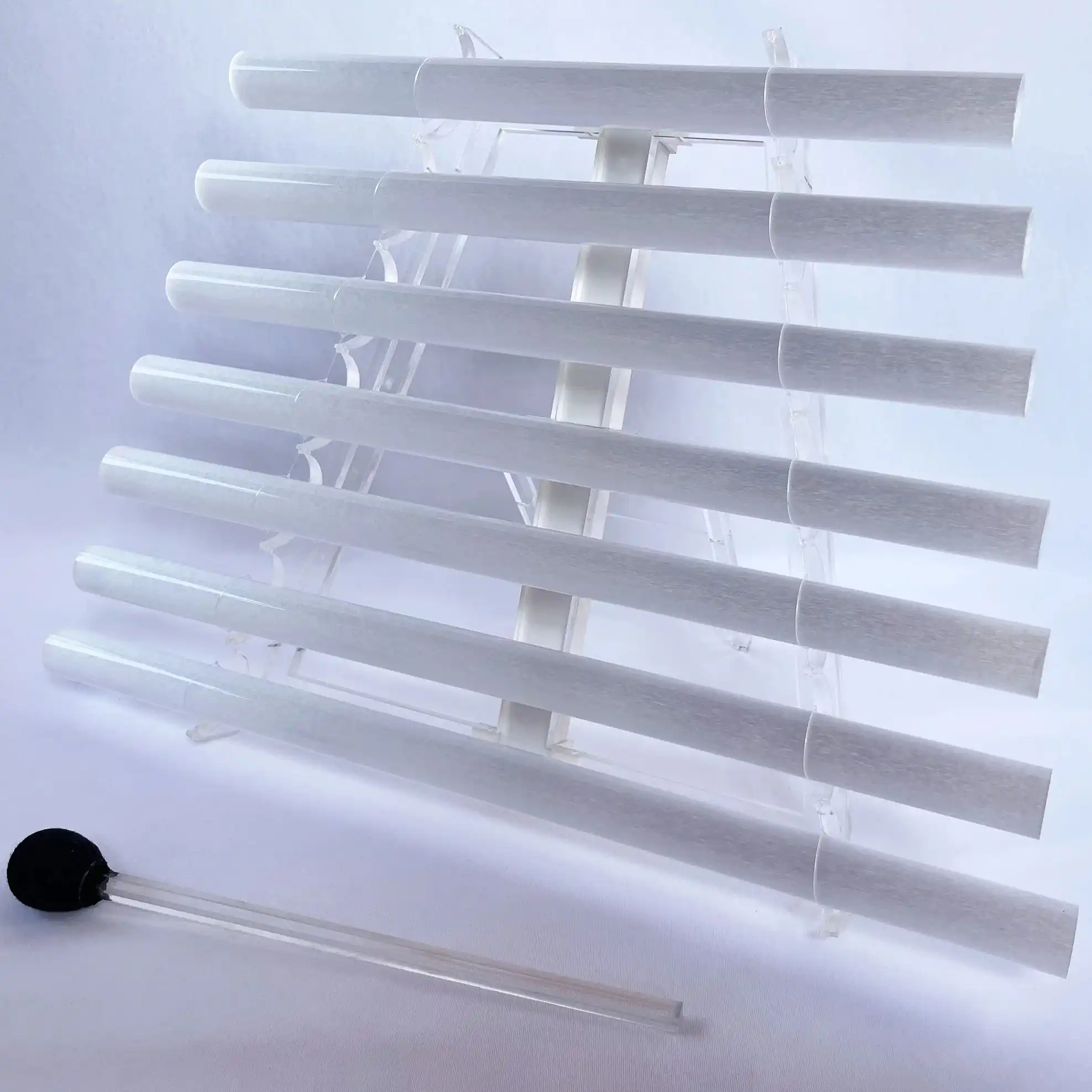 La Arpa de Cuarzo está diseñada con siete piezas de cuarzo blanco montadas en una elegante estructura de acrílico cristalino. Gracias a su sistema cromático con baterías recargables, irradia una suave luz RGB (como se aprecia en la imagen), creando una atmósfera visualmente armoniosa durante su uso.