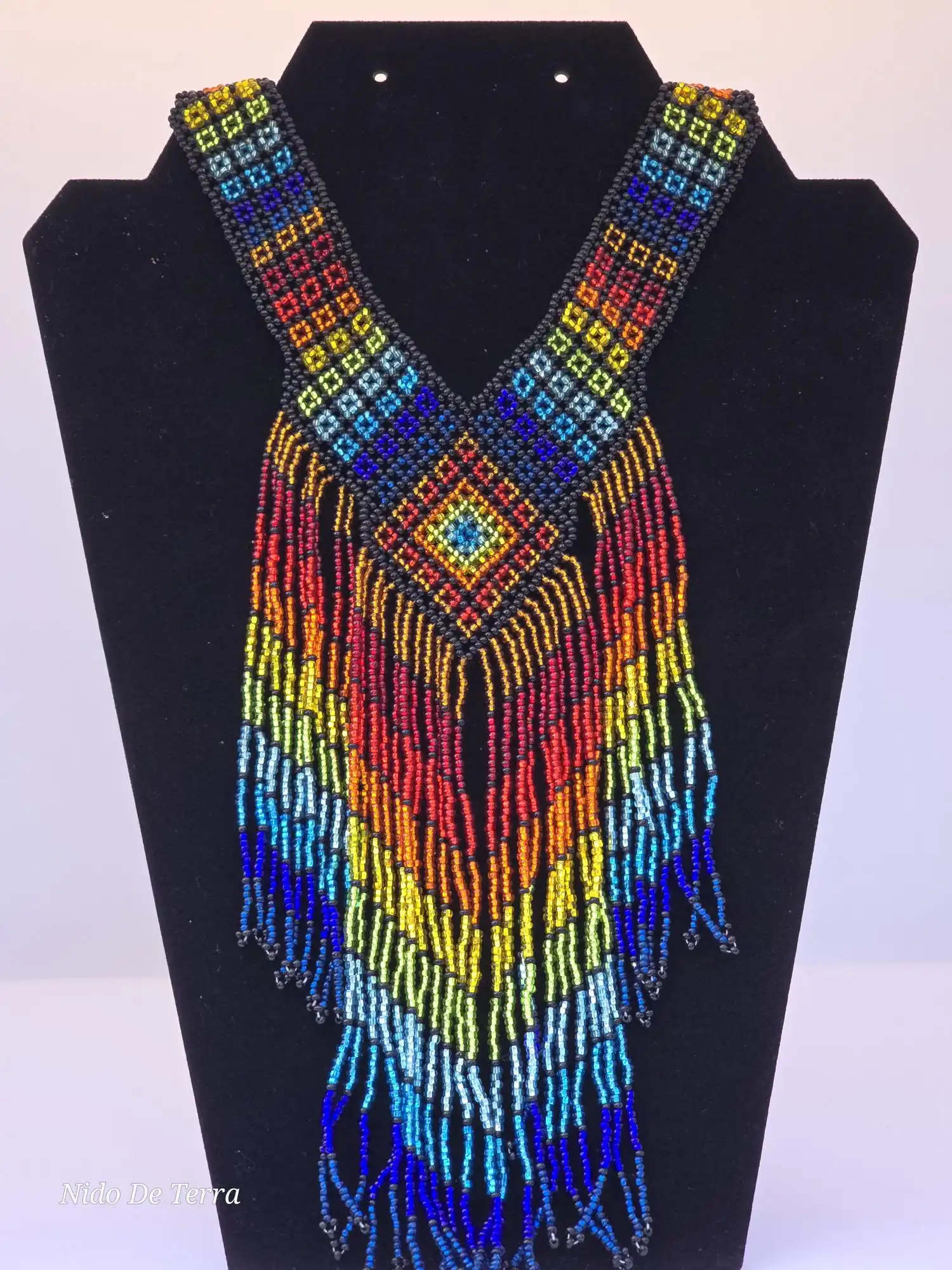 Collar artesanal en chakiras multicolor con diseño romboidal y flecos arcoíris.