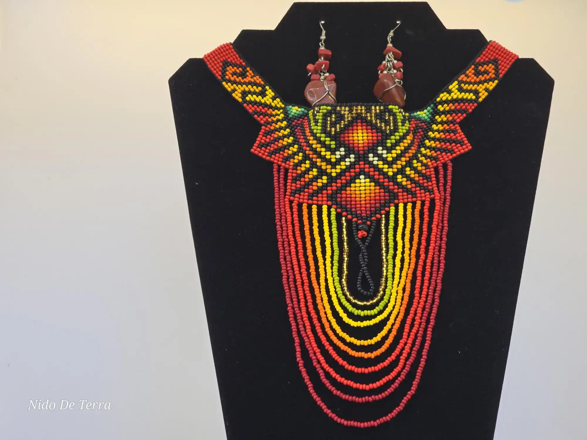 Collar tejido a mano con chakiras en tonos rojo amarillo verde y negro, formando un patrón geométrico simétrico en la parte superior. Desde esta base descienden múltiples hilos de chakiras en capas que crean un efecto de cascada vibrante y ceremonial. La composición celebra la armonía entre color y forma, evocando fuerza identidad y conexión con la tierra. Esta pieza es ideal para quienes buscan portar una joya con presencia cultural y estética poderosa, perfecta para ocasiones especiales o como símbolo de raíz y expresión.