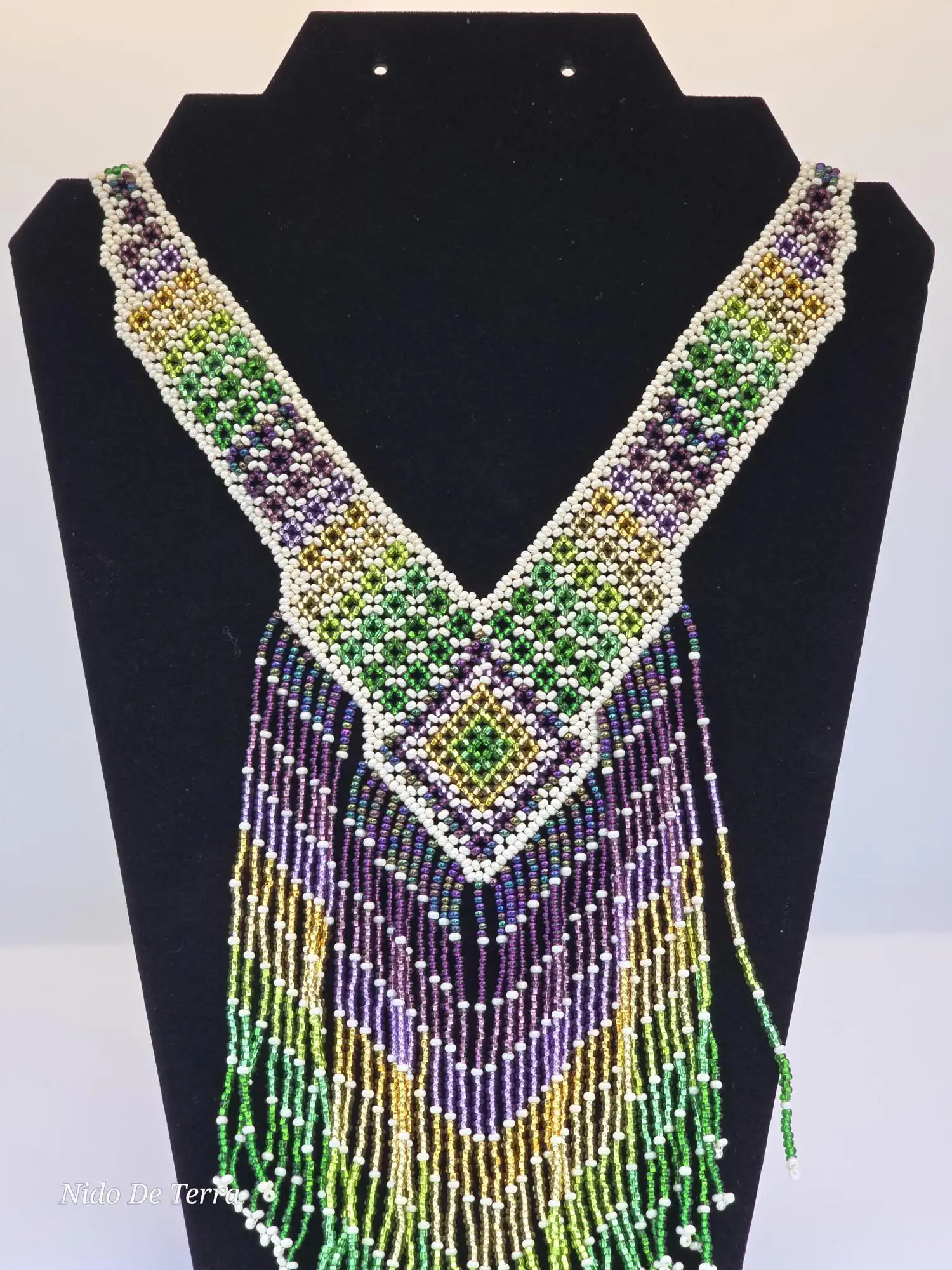 Collar artesanal en chakiras verde morado y blanco con diseño geométrico y flecos colgantes.