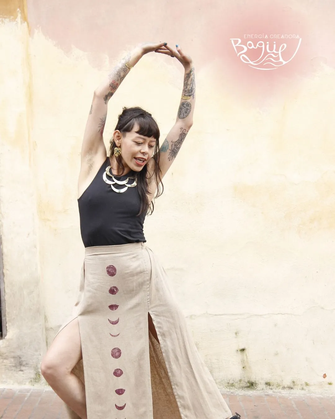 Diseño Consciente: Creada bajo el principio de Cero Residuos (0 RESIDUO), logrando minimizar el desecho textil a solo un 1% en su producción. La falda está elaborada con fibra 100% natural.