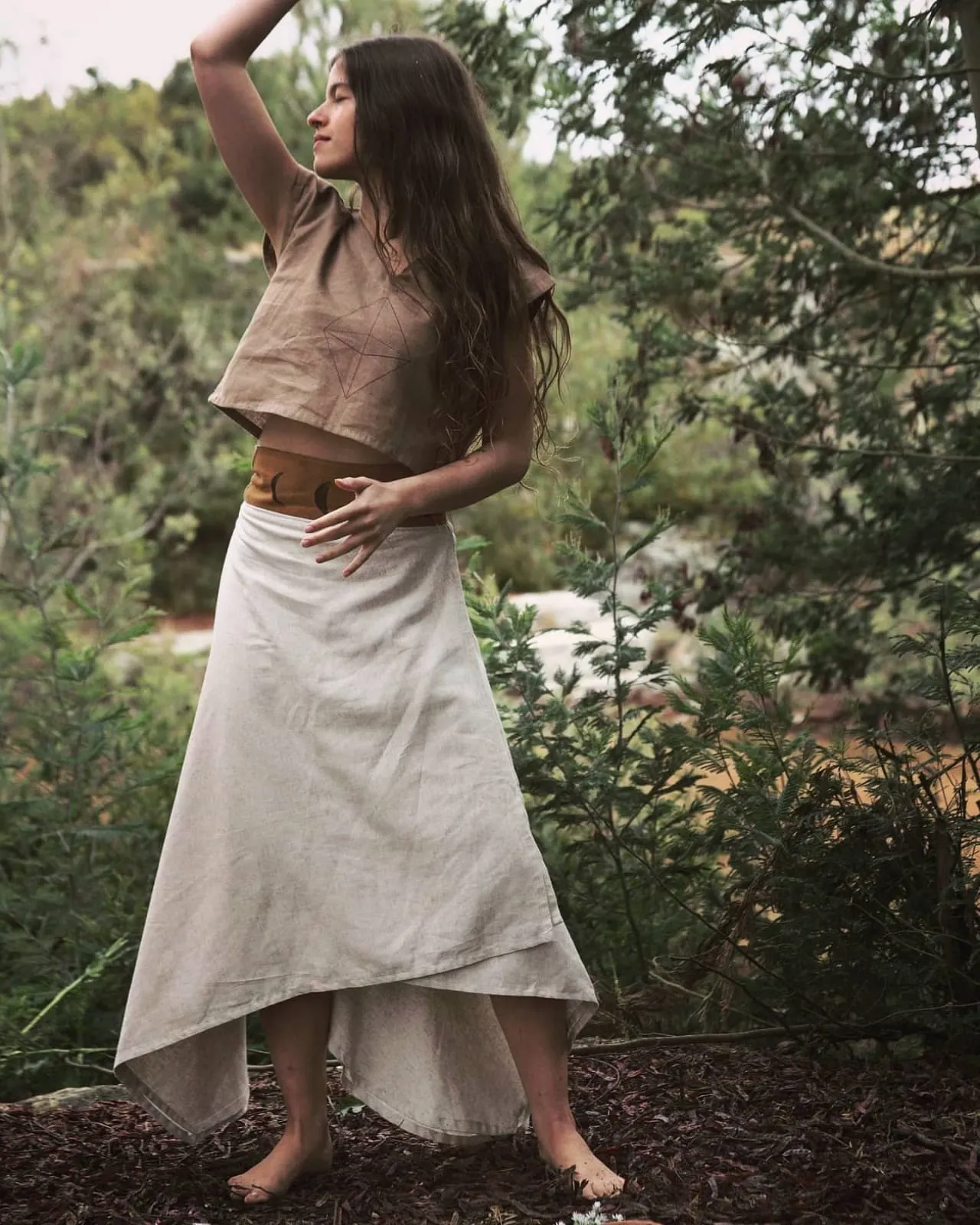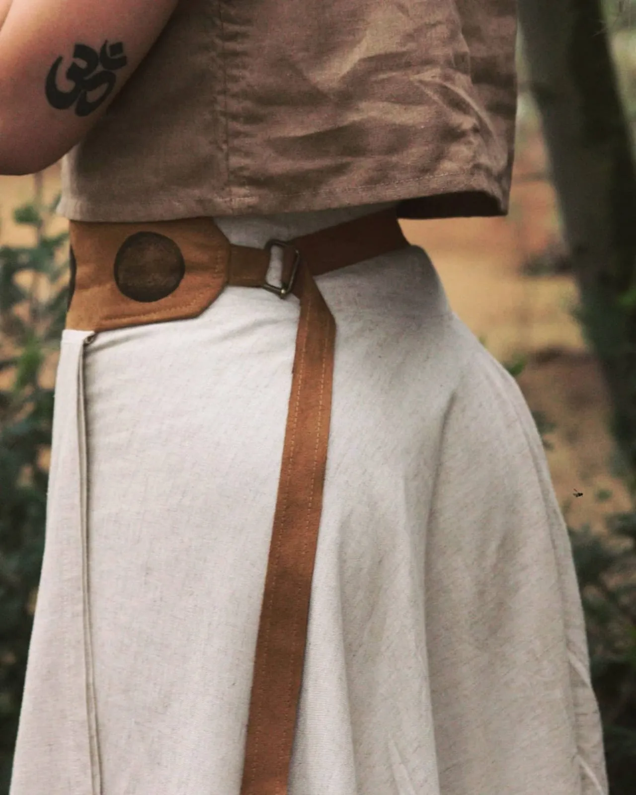 Presentamos la Falda Ciclos Crudo (Pieza Menstrual), una Falda Ritual diseñada para acompañarte en tus ritos cíclicos, el trabajo con el útero y la conexión personal.