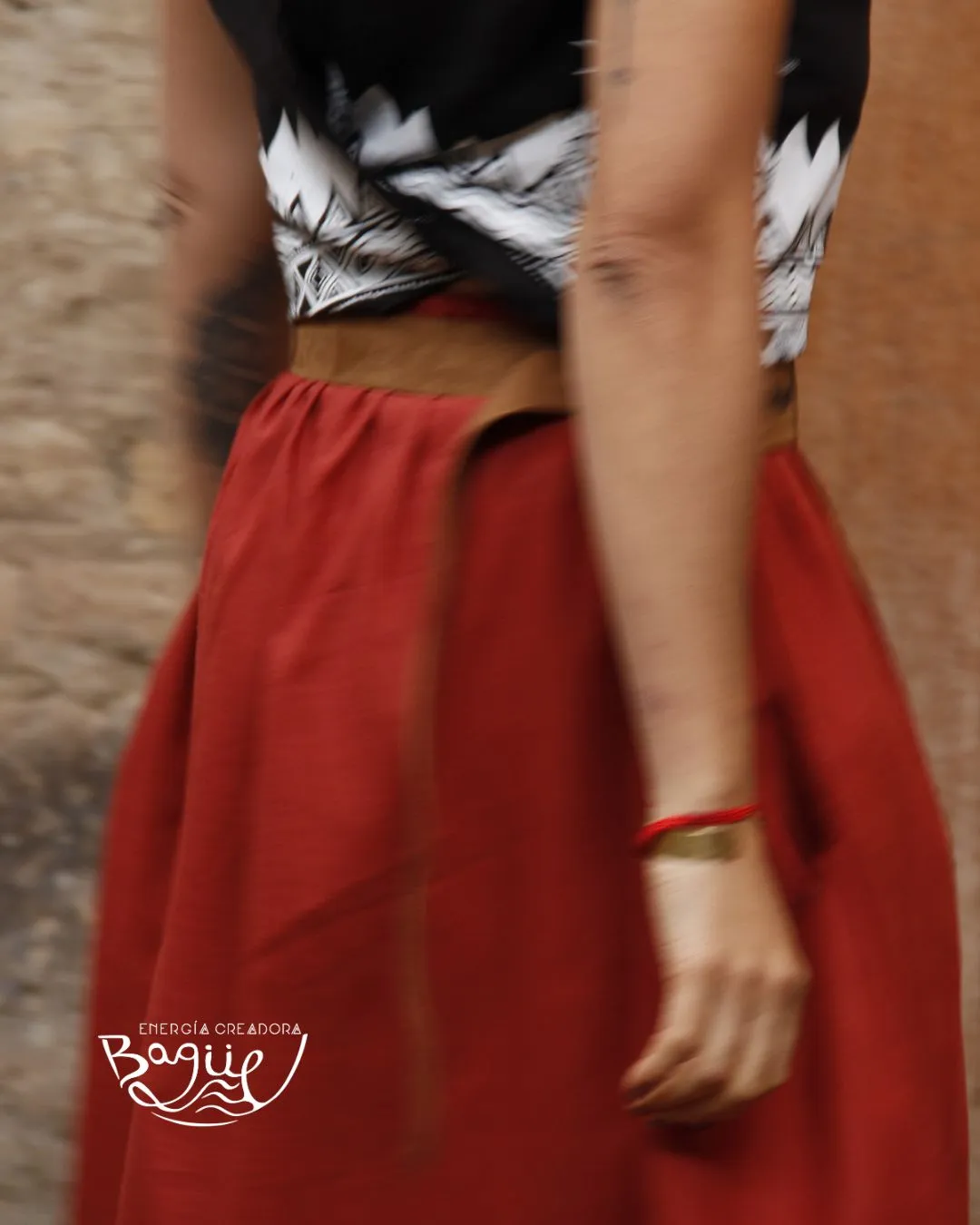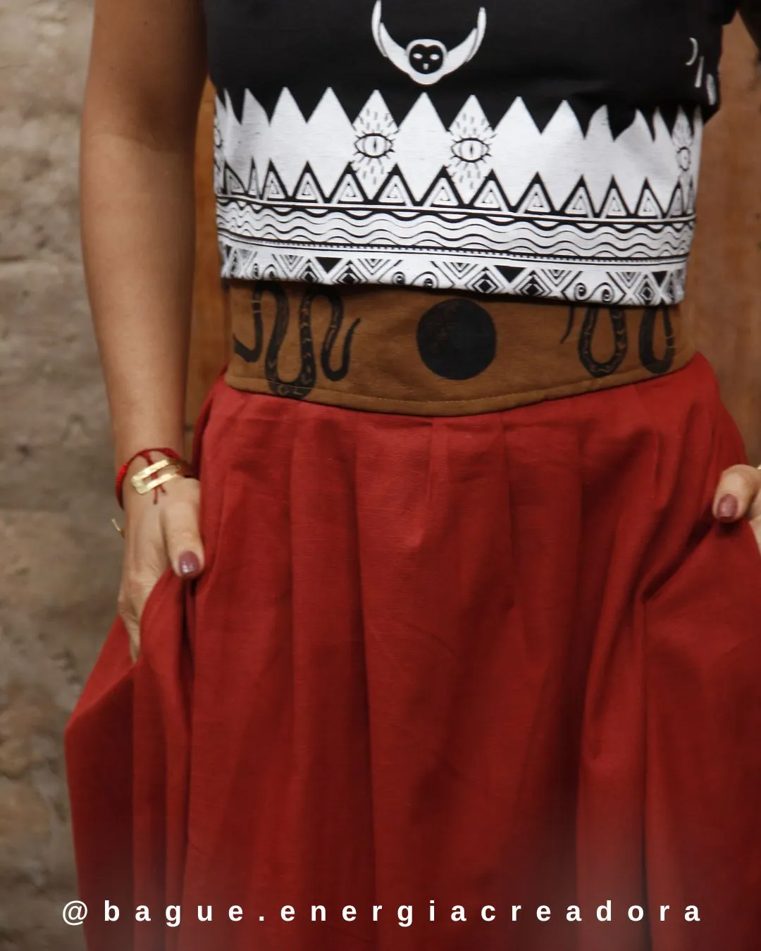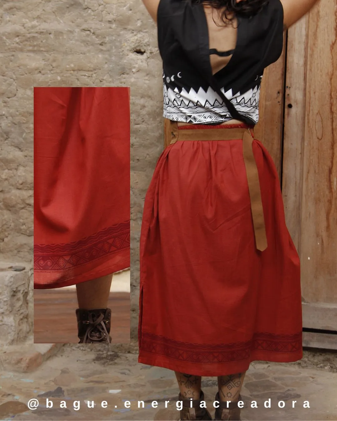 escubre la Falda Huitaca, una pieza de poder diseñada pensando en la funcionalidad y la sostenibilidad. Es una prenda que combina materiales naturales con simbología artesanal.