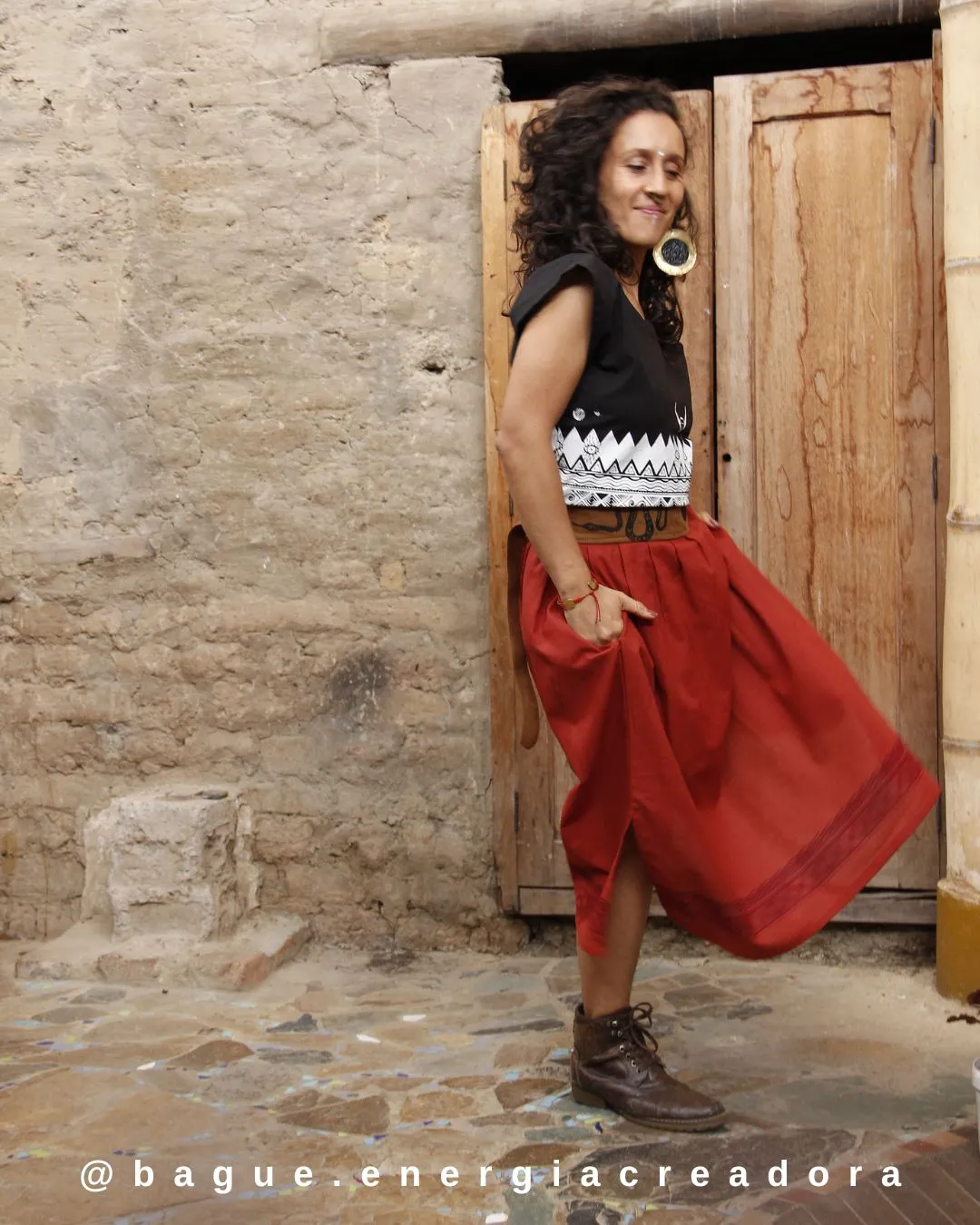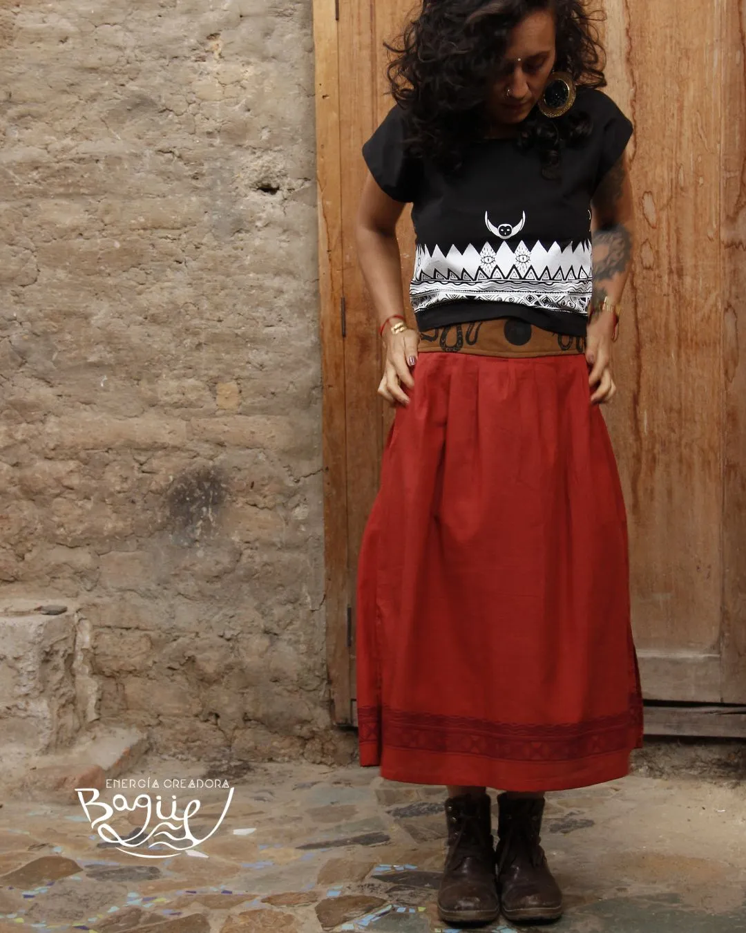 Diseño Consciente: Creada bajo el principio de Cero Residuos (0 RESIDUO), minimizando el desecho textil al 1% en su producción. La falda está elaborada con fibra 100% natural.