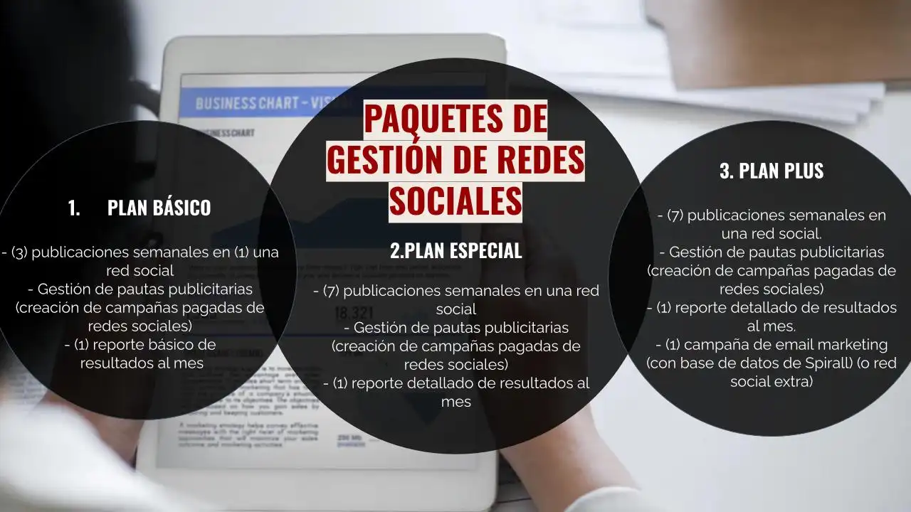 1. Gestión de Redes Sociales (Planes Spirall): Planes estructurados para la creación o refrescamiento de imagen y publicación constante (3 a 4 publicaciones semanales) en 2 a 3 redes sociales. Todos los planes incluyen pauta publicitaria (creación de campañas pagadas), reporte mensual (Básico o Detallado) y el desarrollo de un plan de marketing digital. El plan más avanzado incluye artículos para blog y campañas de email marketing.