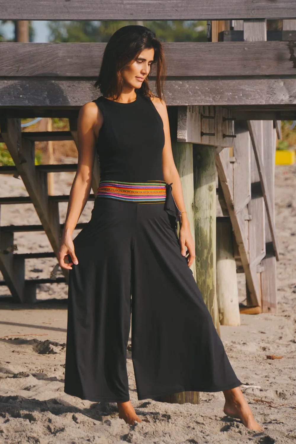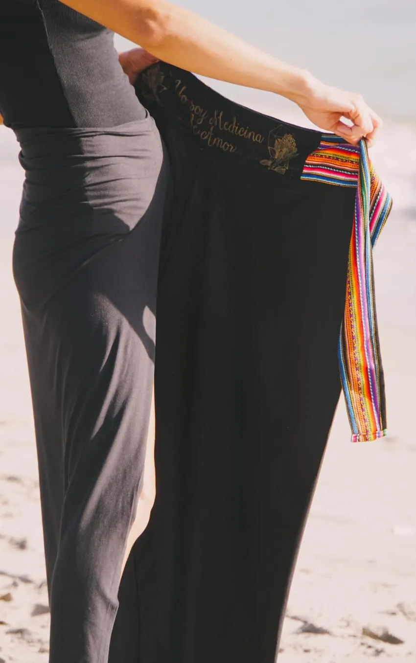 Diseño Funcional y Ritual: Pantalón tipo Mariposa que incluye un Chumbe en Manta Peruana ajustable a cintura y cadera, ideal para sostener y dar calorcito al útero. Posee un bolsillo interno «Yo Soy Medicina de Amor» para colocar cuarzos, plantas o t4b4co (tabaco), portando tu medicina personal.
