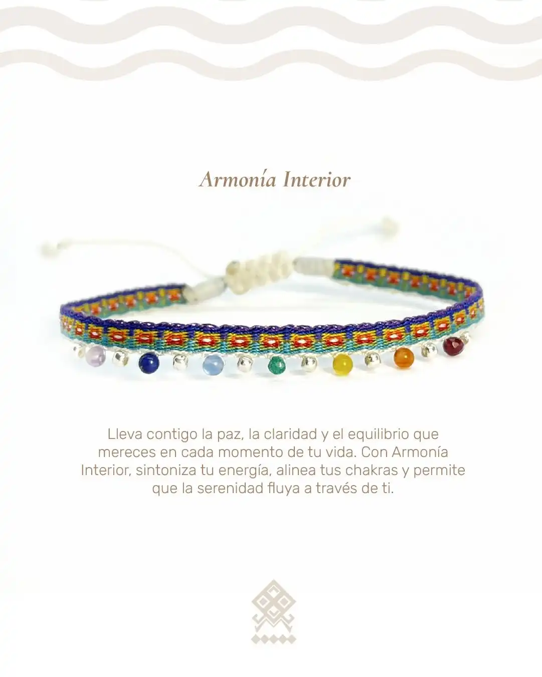 Pulsera artesanal Armonía Interior. Tejido multicolor con 7 cuentas para alinear chakras y equilibrio.