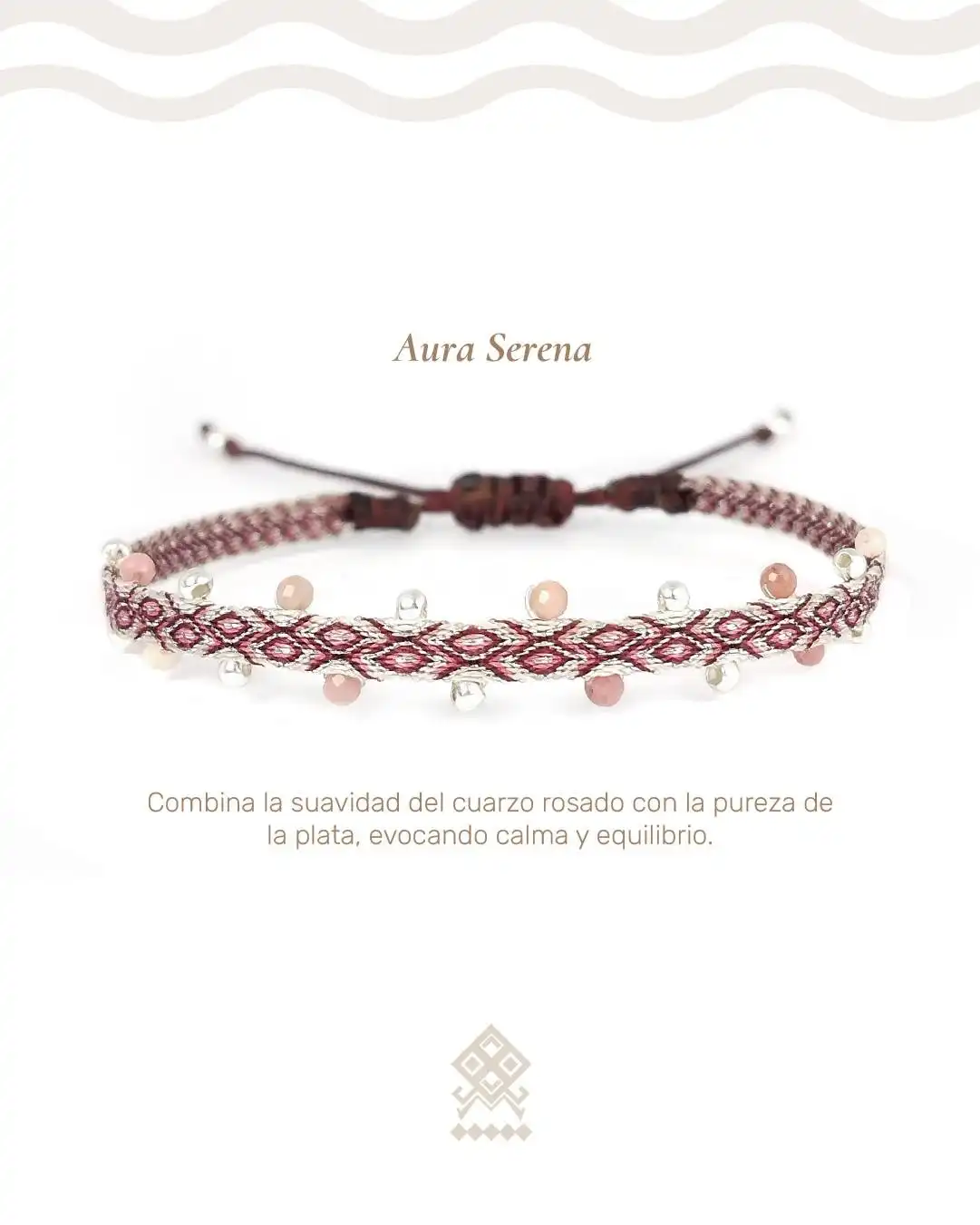 Encuentra la Aura Serena con esta exquisita pulsera artesanal, una joya sutil tejida a mano con profunda dedicación. El cuerpo de la pulsera presenta un intrincado patrón de ondas o rombos en tonos vino tinto y blanco, creando una base texturizada. El diseño cobra vida al combinar la suavidad y el poder del cuarzo rosado (piedra del amor y la calma) con la pureza de los balines de plata, evocando serenidad y equilibrio. Su cierre de macramé deslizable en hilo color vino garantiza un ajuste cómodo y versátil. Es el amuleto perfecto para llevar a diario. Adquiere esta pieza única y luce la calidad, el significado profundo y el valor inigualable de una creación genuinamente hecha a mano.