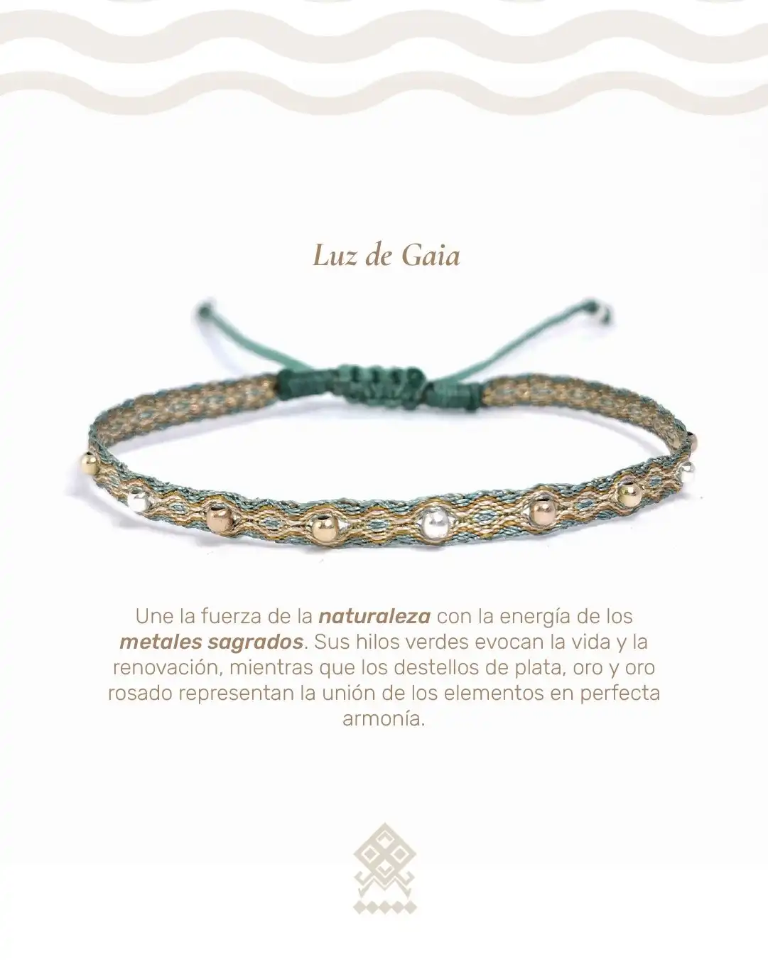 Descubre la Luz de Gaia con esta pulsera artesanal que une la fuerza de la naturaleza con la energía de los metales sagrados. Tejida a mano con hilos verdes y dorados que evocan la vida y la renovación, esta joya presenta un delicado patrón de ondas. El diseño se realza con la inclusión de pequeños balines metálicos que alternan entre tonos de oro, plata y oro rosado, representando la unión de los elementos en perfecta armonía. Su cierre de macramé deslizable en hilo verde oscuro garantiza un ajuste cómodo y seguro. Es el accesorio ideal para llevar un recordatorio de equilibrio y vitalidad. Adquiere esta pieza única y luce la calidad, el significado profundo y el valor inigualable de una creación genuinamente hecha a mano.