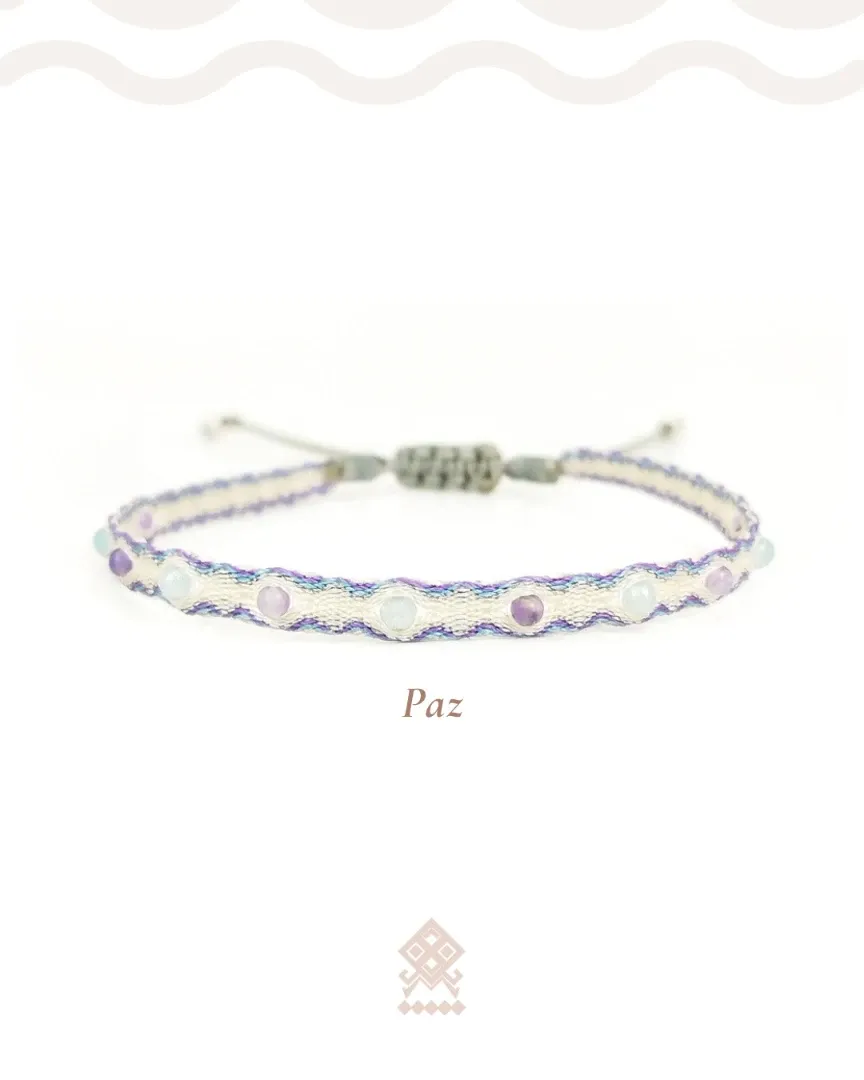 Encuentra la Paz y la serenidad con esta pulsera artesanal, una joya delicadamente tejida a mano con hilos finos. El cuerpo de la pulsera presenta una base en color crudo, realzada con un sutil hilo tornasol o iridiscente (morado y azul pálido) que le otorga un brillo mágico. El diseño está embellecido con pequeñas piedras naturales intercaladas, como amatistas (lavanda) para la calma y aguamarina (verde pálido) para la claridad. Su cierre de macramé deslizable en hilo gris claro garantiza un ajuste cómodo y seguro. Es el amuleto perfecto para llevar a diario, que combina el significado de las piedras con la belleza de la artesanía. Adquiere esta pieza única y luce la calidad, el significado profundo y el valor inigualable de una creación genuinamente hecha a mano.