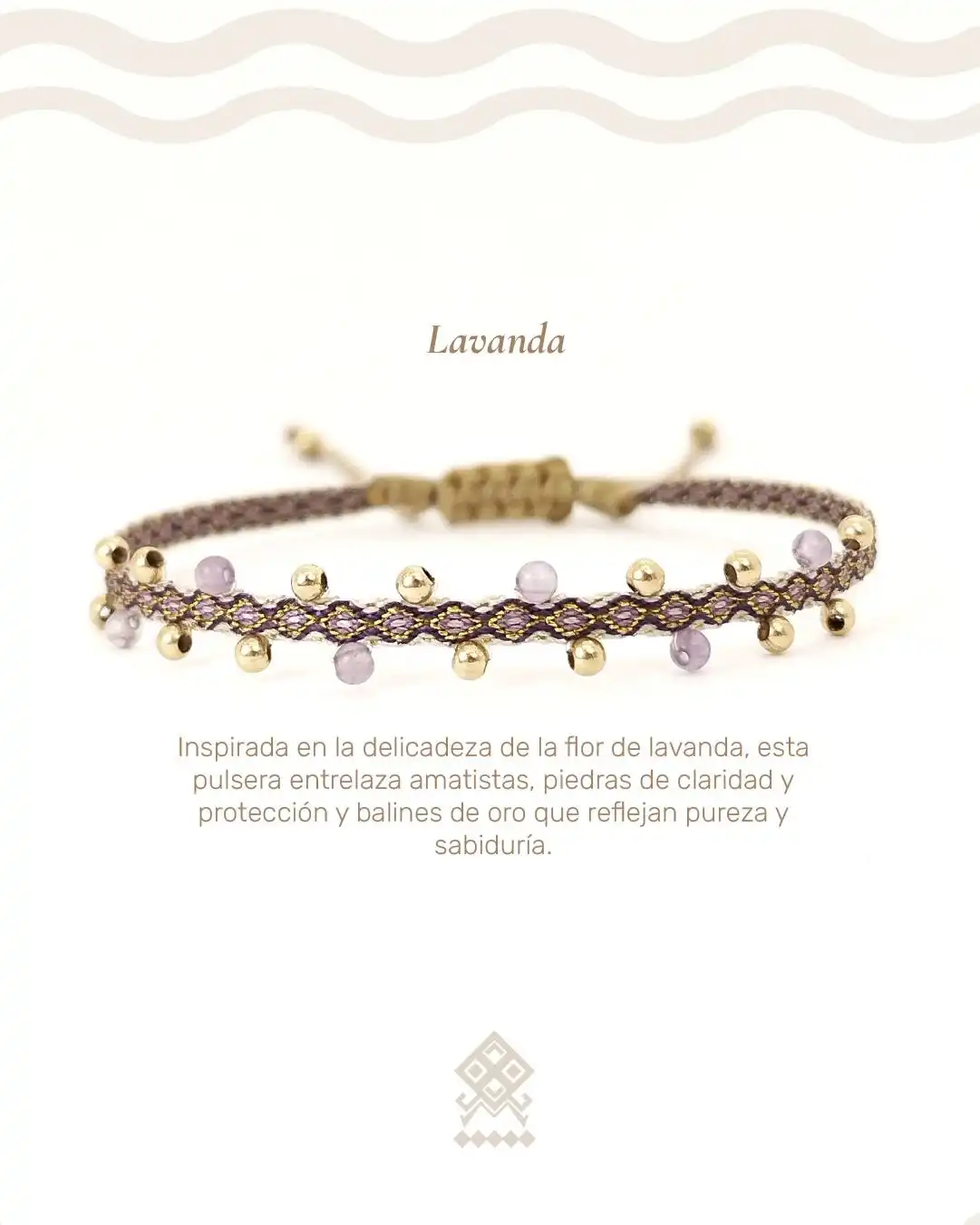 Inspírate en la tranquilidad y delicadeza con esta pulsera artesanal Lavanda, una pieza magistral tejida a mano con hilos de alta calidad. El diseño evoca la belleza de la flor de lavanda al entrelazar diminutas piedras de amatista, conocidas por sus propiedades de claridad y protección, con brillantes balines de oro que reflejan pureza y sabiduría. La pulsera se asienta sobre un hilo tejido en un tono neutro (gris/marrón), y su cierre de macramé deslizable garantiza un ajuste perfecto. Es el regalo ideal o un amuleto personal que combina la energía de las piedras naturales con la sofisticación del diseño artesanal. Adquiere esta joya y luce la calidad, el significado profundo y el valor inigualable de una creación genuinamente hecha a mano.