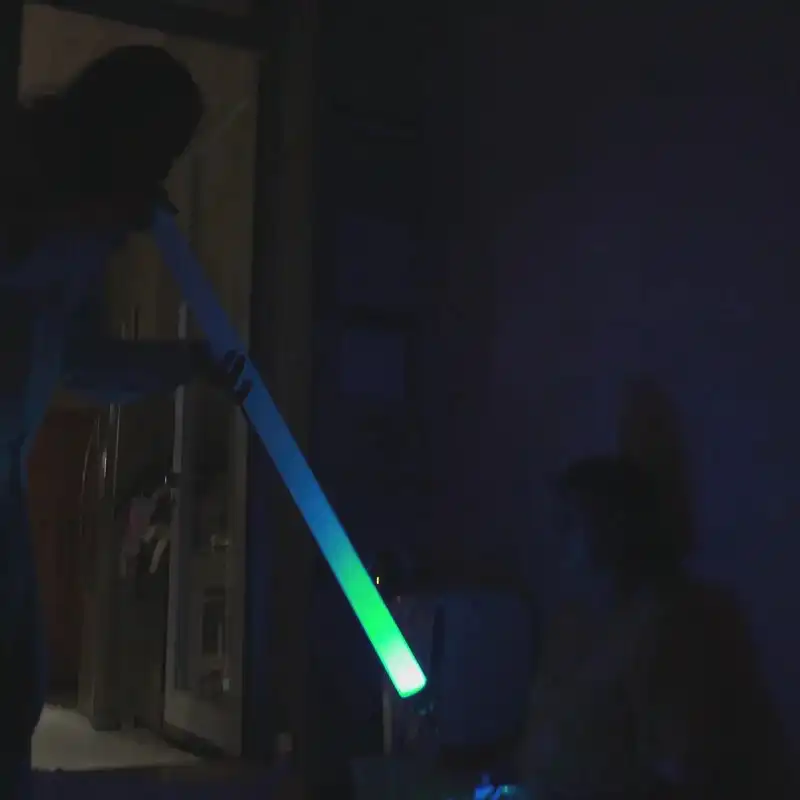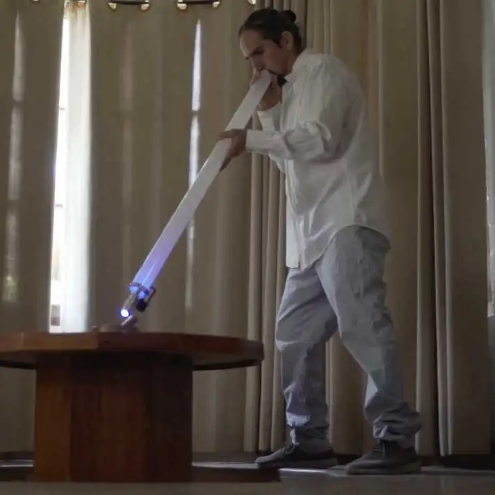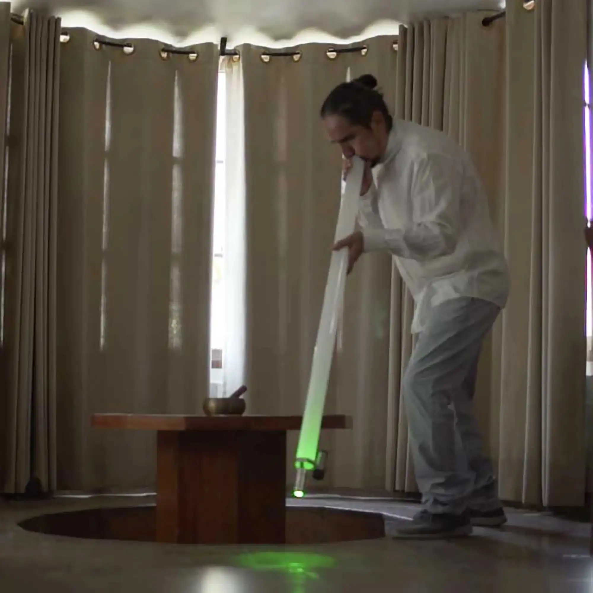 Sus dimensiones (102 cm de largo y 6 cm de diámetro) proporcionan una resonancia profunda y envolvente. La característica más notable es la inclusión de una linterna cromática electrónica en su interior. Con solo pulsar un botón, puedes seleccionar instantáneamente entre 7 vibrantes colores, permitiéndote dirigir la energía del sonido y del color hacia el receptor (como se observa en las imágenes) o ambientar el espacio.