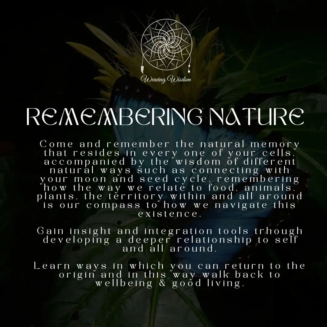RECORDANDO LA NATURALEZA es un programa de acompañamiento diseñado para guiarte en un profundo viaje de autodescubrimiento y reconexión con el mundo natural. A través de una variedad de herramientas y ejercicios, aprenderás a desarrollar una relación más profunda contigo mismo y con todo lo que te rodea. Explorarás la alquimia de co-crear una vida en resonancia con el llamado de tu corazón, alineando tus sentimientos, pensamientos, palabras y acciones para caminar de manera más íntegra. Descubrirás la sabiduría que ha estado viva desde la memoria original de nuestra creación, incluyendo formas ancestrales de relación, comunicación y comunión con la naturaleza. Aprenderás secretos y caminos para alquimizar el propósito de tu vida en manifestación, entendiendo cómo tu relación con la comida, los animales, las plantas y el territorio tiene un impacto directo en todos los seres vivos. También conectarás con tu ciclo lunar y de siembra. Este programa te enseñará a navegar el mundo moderno con el conocimiento del mundo natural, aplicando enseñanzas místicas de forma práctica para el beneficio de todos. Si se utiliza algún material de apoyo o guía para las prácticas, este será de naturaleza artesanal, honrando la conexión consciente con la creación.