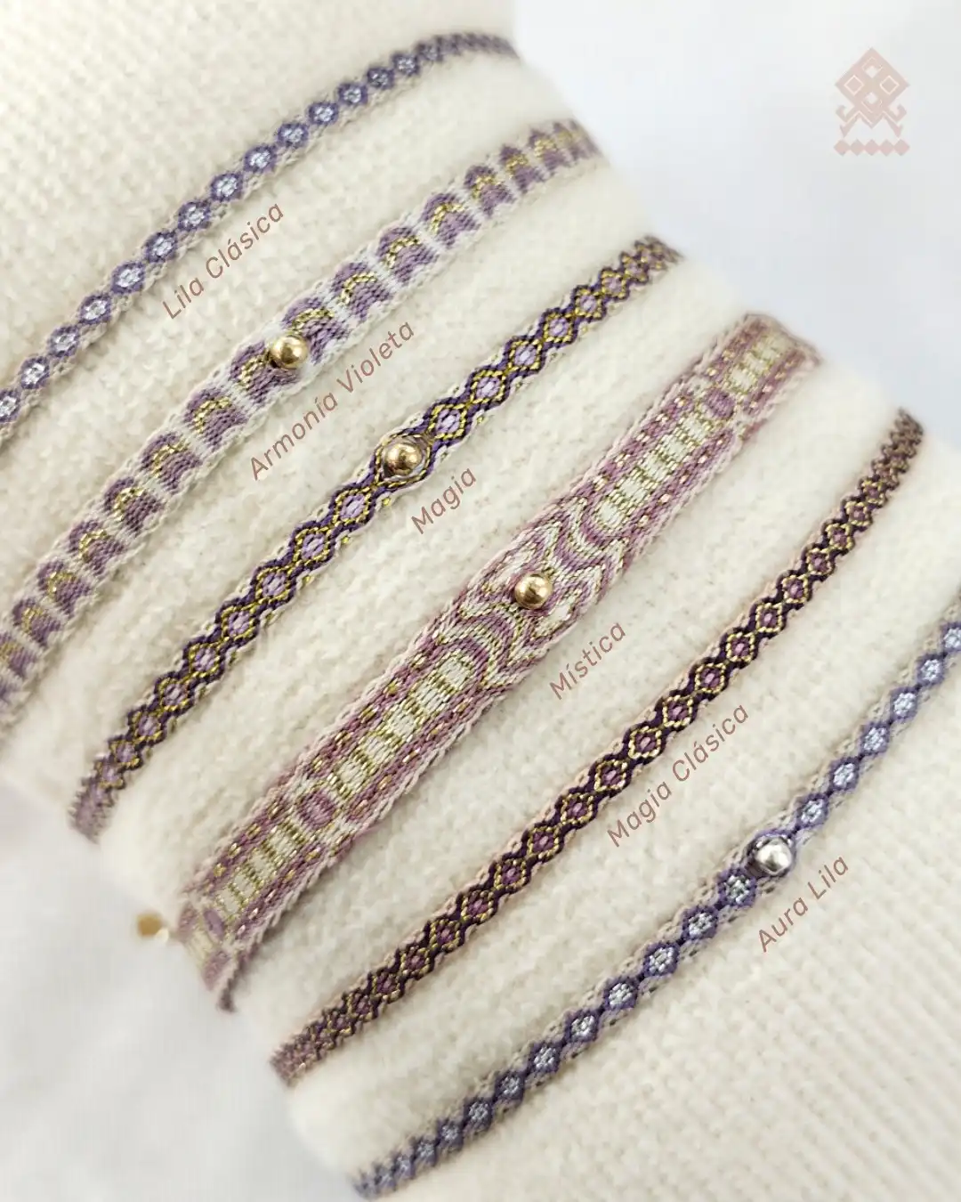 Colección artesanal de pulseras lila y dorado. Variedad de tejidos místicos y balines dorados/plateados.