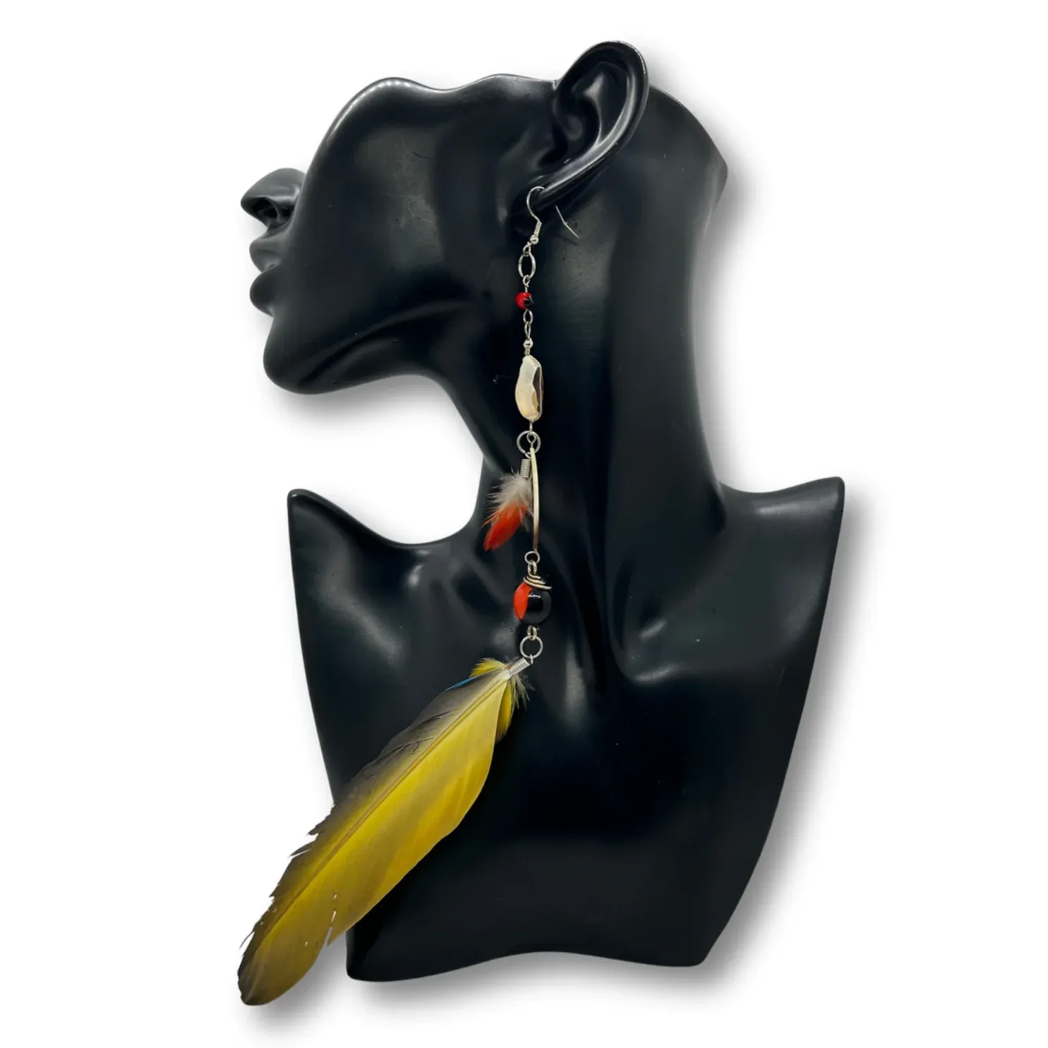 Arete Solitario de pluma de guacamayo, dije de semilla, cuentas rojas y colgante de colibrí.