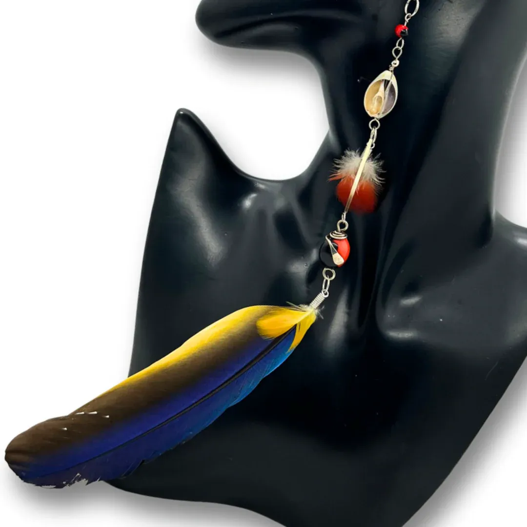 Detalle Amazónico: La pieza culmina con una gran pluma natural tricolor (azul, marrón y amarillo), que añade un toque de color salvaje y movimiento, característico de las plumas de guacamayo.