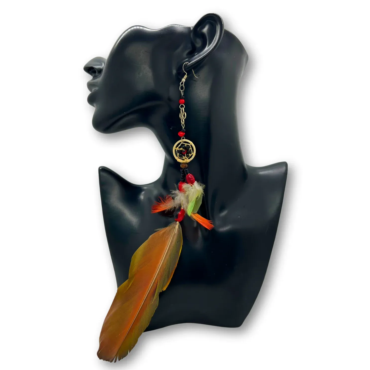 Diseño y Simbología: El arete presenta un dije de atrapasueños tejido con chaquira negra y amarilla, que representa la conexión con motivos celestiales. La cadena de cuentas incluye tonos rojo coral y amarillo, junto con un pequeño dije de pájaro/colibrí esmaltado en verde y naranja, evocando la sabiduría de la fauna.