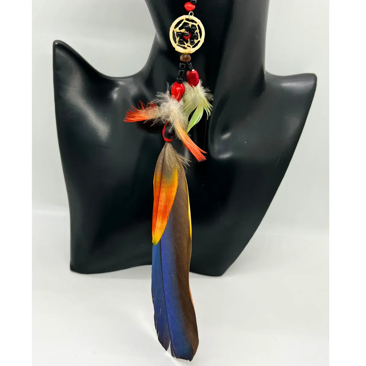 Detalle Amazónico: La pieza culmina con una gran pluma natural tricolor (azul, marrón, amarillo y rojo), que añade un toque de color salvaje y movimiento, característico de las plumas de guacamayo.