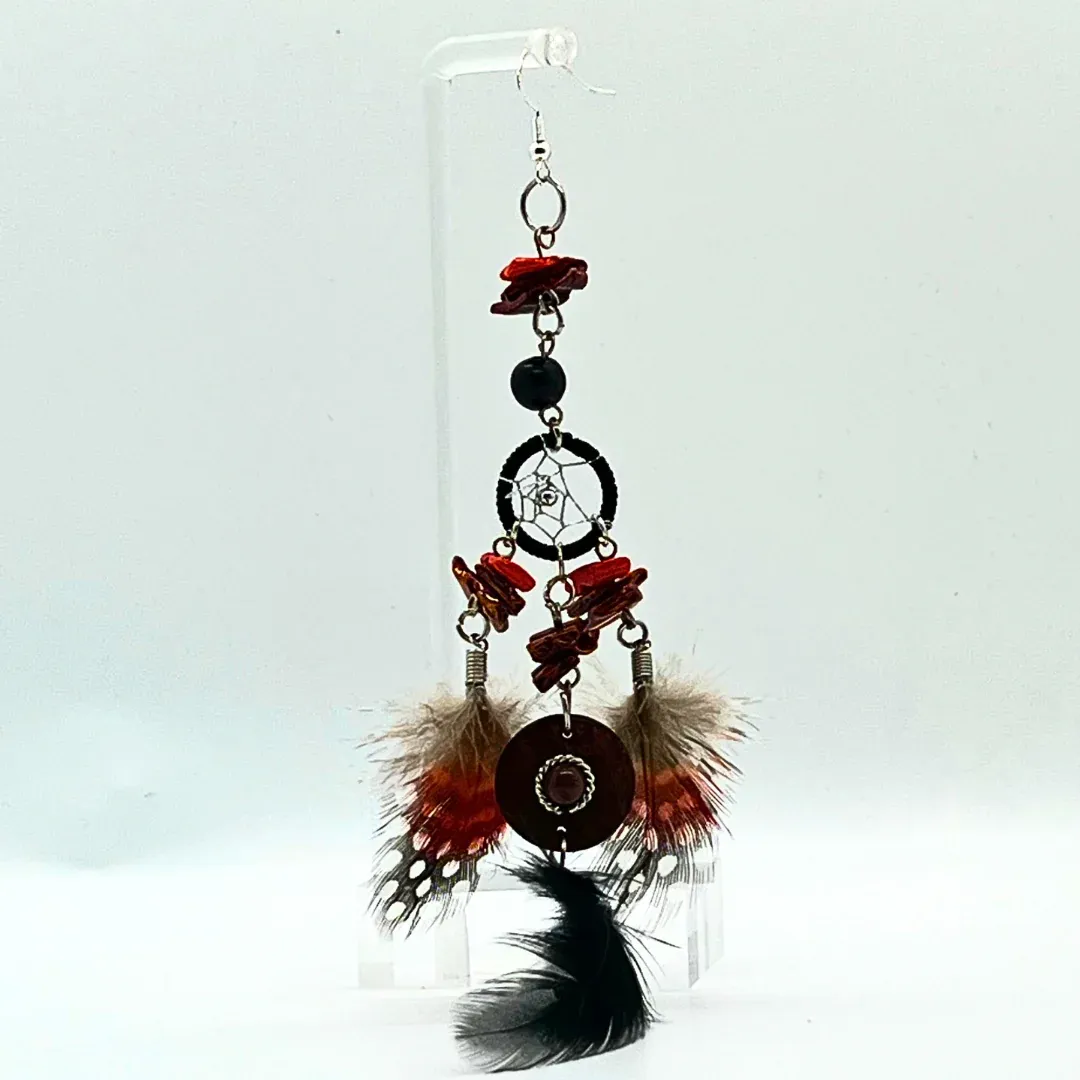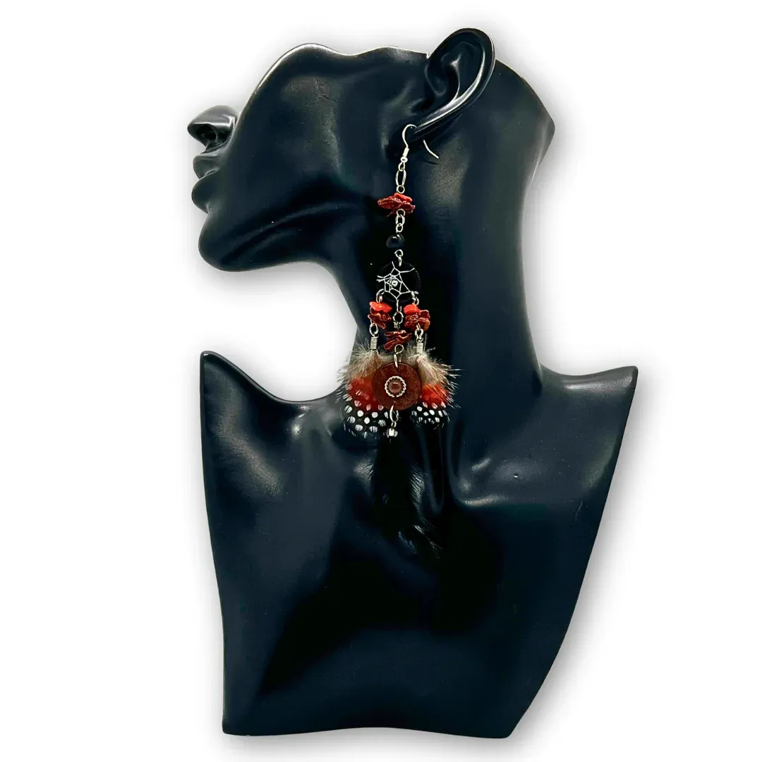 Diseño y Simbología: El arete presenta una cadena de cuentas que incluye tonos rojo coral y negro (similares a las semillas de huayruro) y detalles metálicos plateados. En el centro, un dije tribal calado de metal representa la conexión con la espiritualidad y los motivos sagrados. Además, incluye un detalle de plumas pequeñas jaspeadas en el centro.