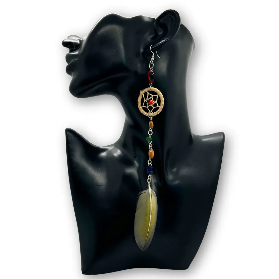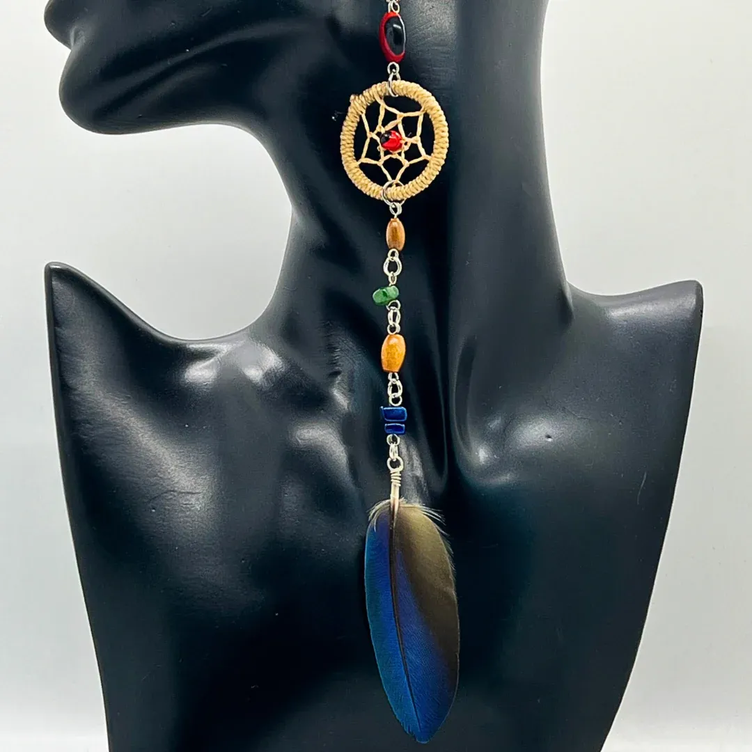Arete Solitario de pluma amazónica, atrapasueños y cadena de piedras que evocan los chakras.