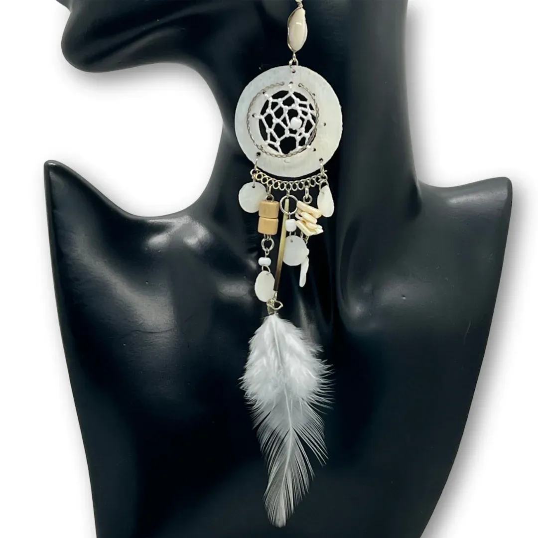 Arete Solitario atrapasueños en nácar, pluma blanca amazónica, semillas y estilo minimalista.