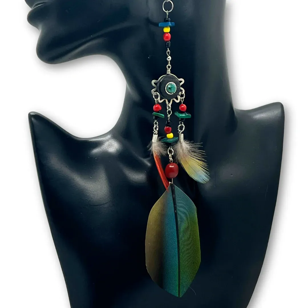 Detalle Amazónico: La pieza culmina con una gran pluma natural de color verde, azul y marrón, que añade un toque de color salvaje y movimiento, característico de las plumas de guacamayo.