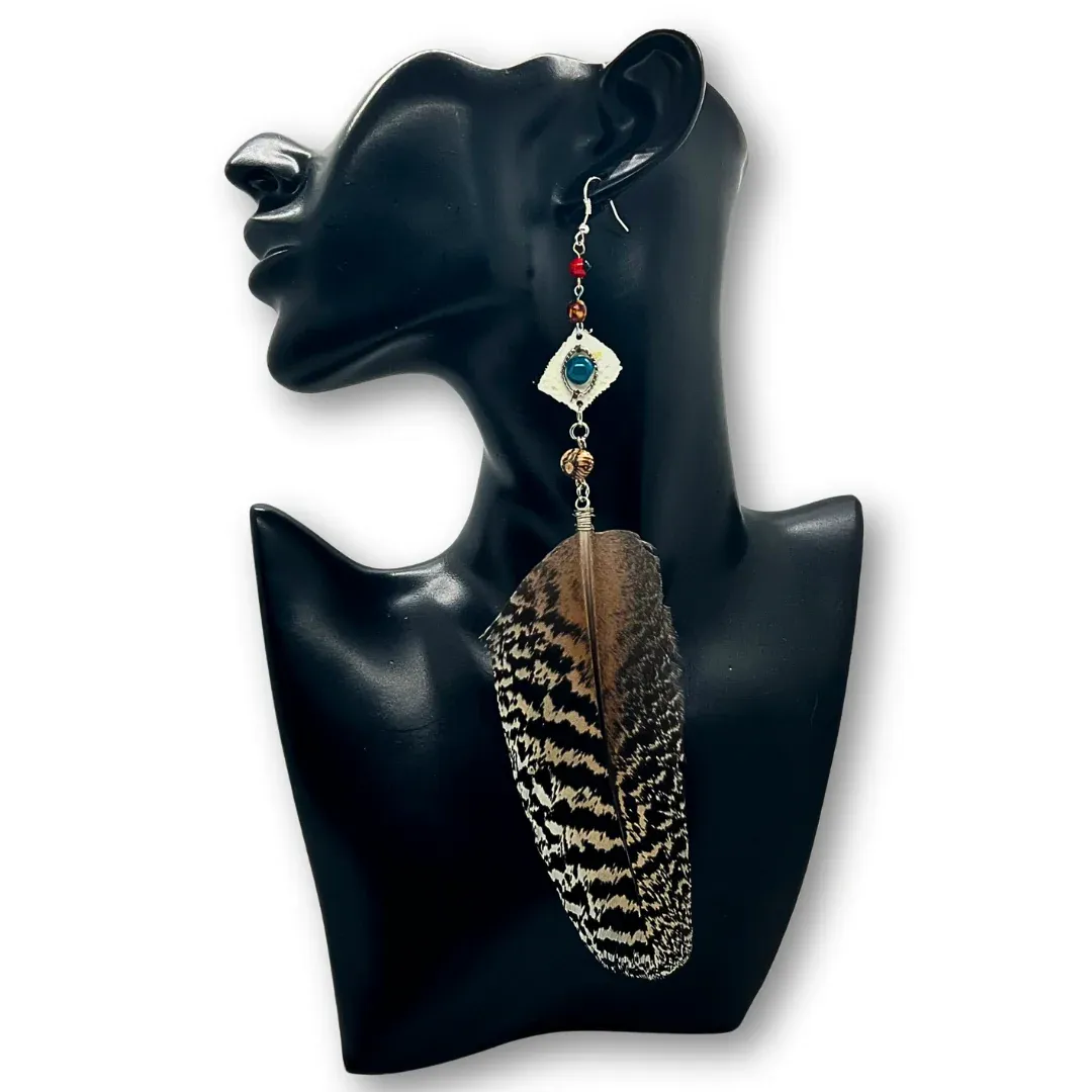 Detalle Amazónico: La pieza culmina con una gran pluma natural jaspeada, con patrones de rayas y manchas en tonos marrón oscuro y beige, que recuerdan la piel de un jaguar. Esta pluma añade un toque de dramatismo y movimiento, característico de las plumas de aves de la selva.