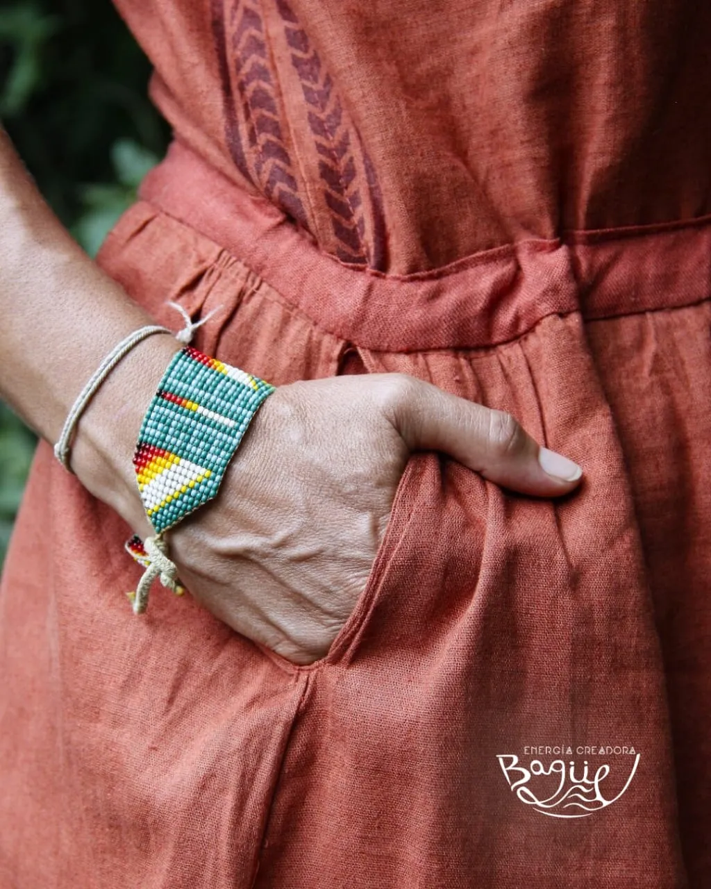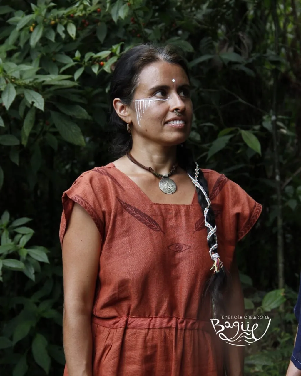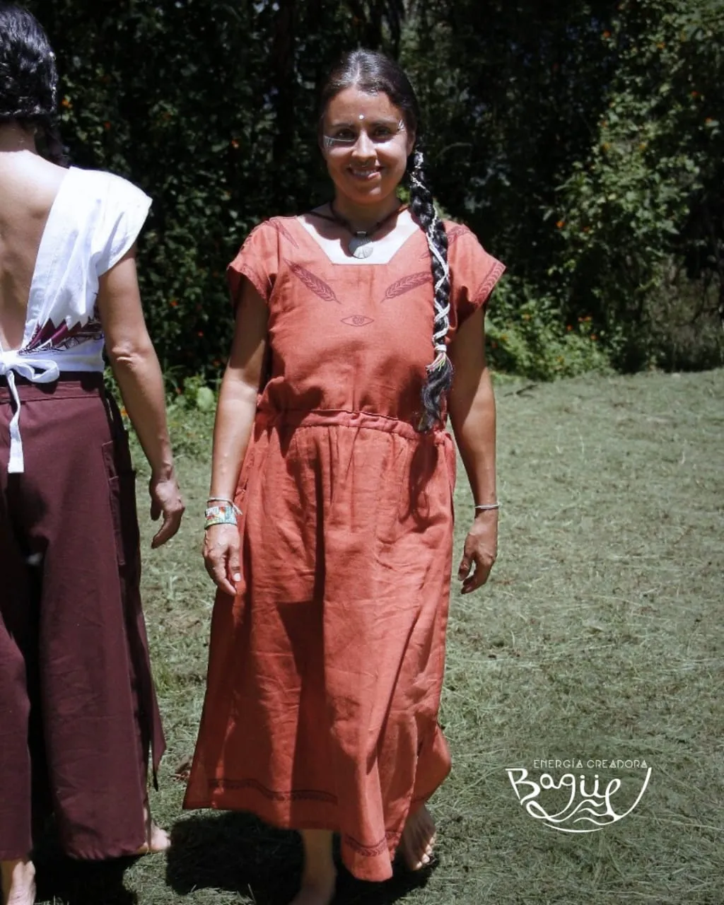 Artesanía y Funcionalidad: Su estampación es manual, realizada con sellos tallados por nosotras, utilizando tintas a base de agua. Además, trae prácticos bolsillos y es ajustable a la cintura.